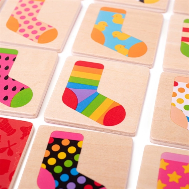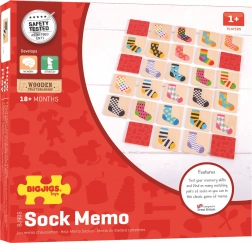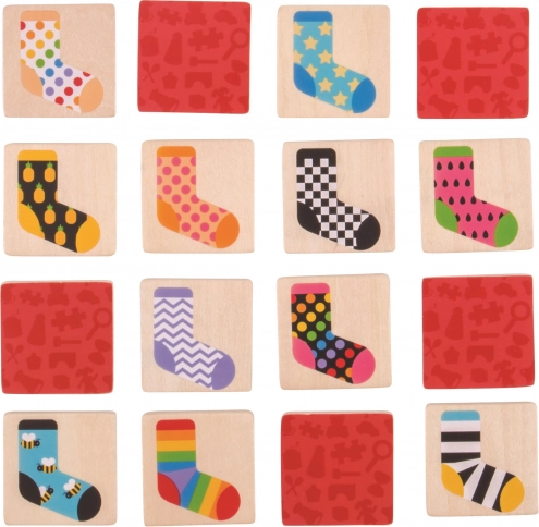 Obogatite trenutke igre z otroki z lesenim spominom z nogavicami. Ta igra spodbuja spomin in podpira osredotočenost ter razvoj strateških sposobnosti. Vse, kar potrebujete, je razporediti 32 delcev obrnjenih navzdol in začeti razkrivati dva kosa hkrati. Težavnost se postopoma povečuje, igralec pa poskuša združiti pare nogavic in si osvojiti nove strategije.