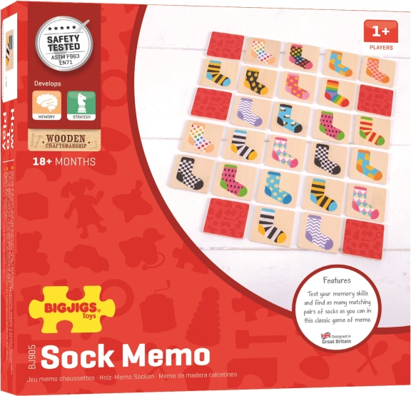 V igri zmaga tisti, ki na koncu ima največ parov nogavic. A zabave ni konec, saj spomin tudi spodbuja interaktivno igro z drugimi otroki, s čimer se razvija njihovo besedišče. Narejeno je iz visokokakovostnega lesa, ki ustreza evropskim varnostnim standardom.