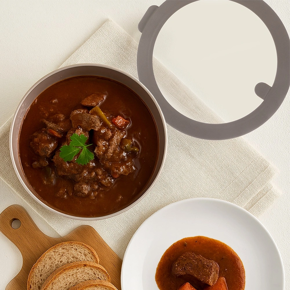 Ta robustna skleda v sodobnem bež odtenku olajša vsakodnevno kuhanje in pripravo večjih porcij. Zahvaljujoč prozornemu okencu v pokrovu imate pregled nad vsebino brez odpiranja, medtem ko parni ventil omogoča varno pogrevanje v mikrovalovni pečici. Tesnilni obroč pomaga ohranjati svežino in zmanjšuje uhajanje vonjav.