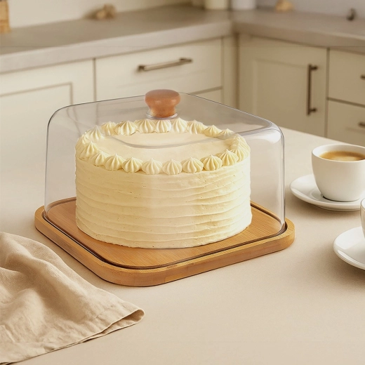Elegantna kvadratna bambusova deska s prozornim pokrovom ohranja vaše sire, sladice in prigrizke dalj časa sveže. Higienska zaščita pred prahom in žuželkami, okolju prijazen bambus in priročen ročaj pokrova naredijo ta kos idealno izbiro za dom in vrtne zabave.