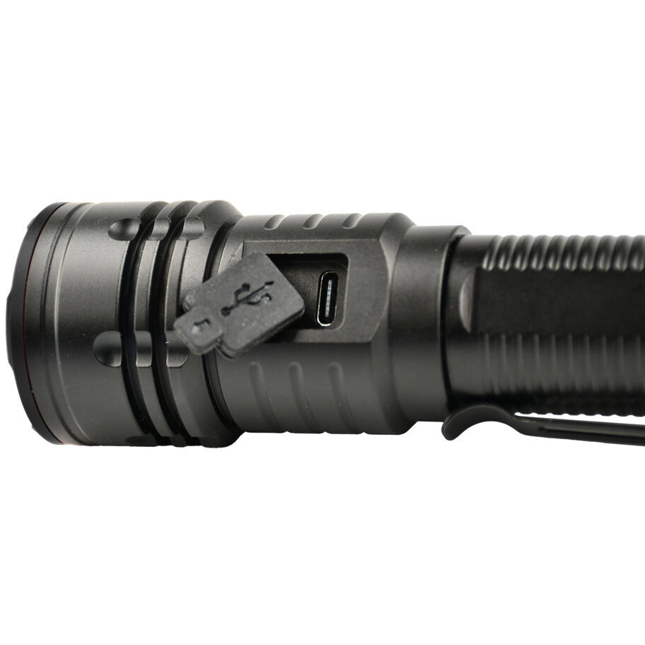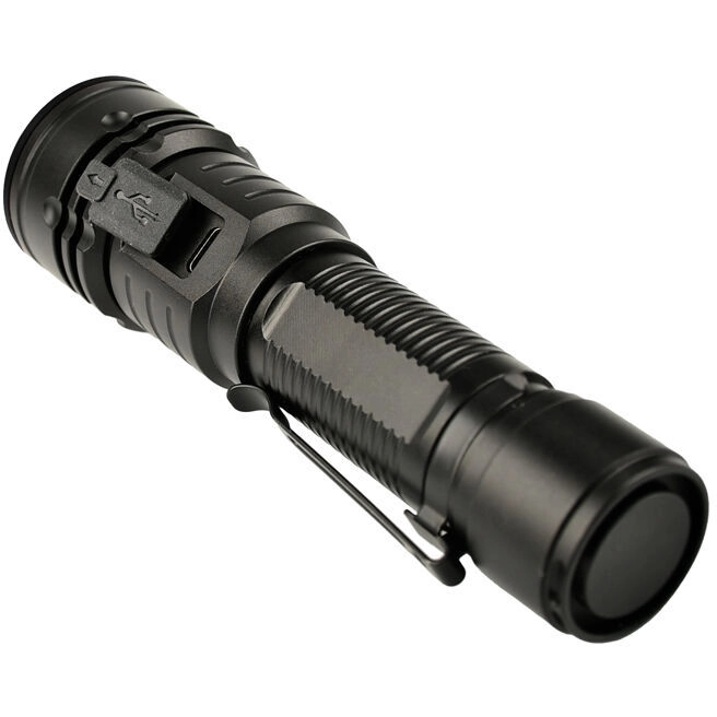 Upravljanje je intuitivno: stranski gumiran gumb omogoča hitro preklapljanje med 3 stopnjami svetilnosti in aktivacijo SOS za nujne primere. Vgrajeno polnjenje prek USB‑C je priročno doma in na terenu, zamenljiva li‑ion baterija 18650 (2200 mAh) pa nudi do 8 ur delovanja. Klips zagotavlja varno pripetje na žep ali opremo.