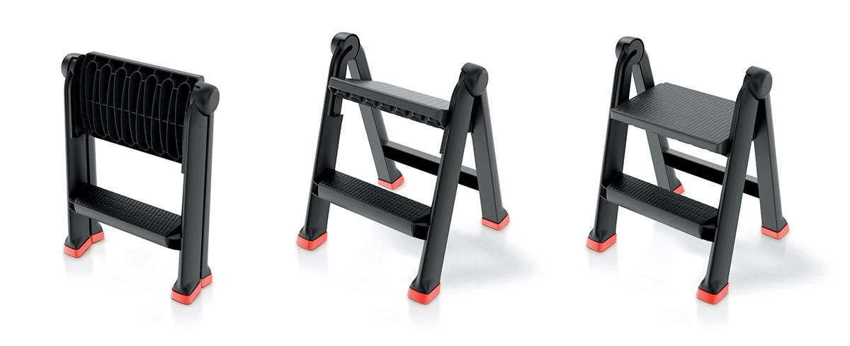 Stopnice zložite v raven, ploščat format v hipu – idealno za prihranek prostora v shrambi, omari ali prtljažniku avtomobila.