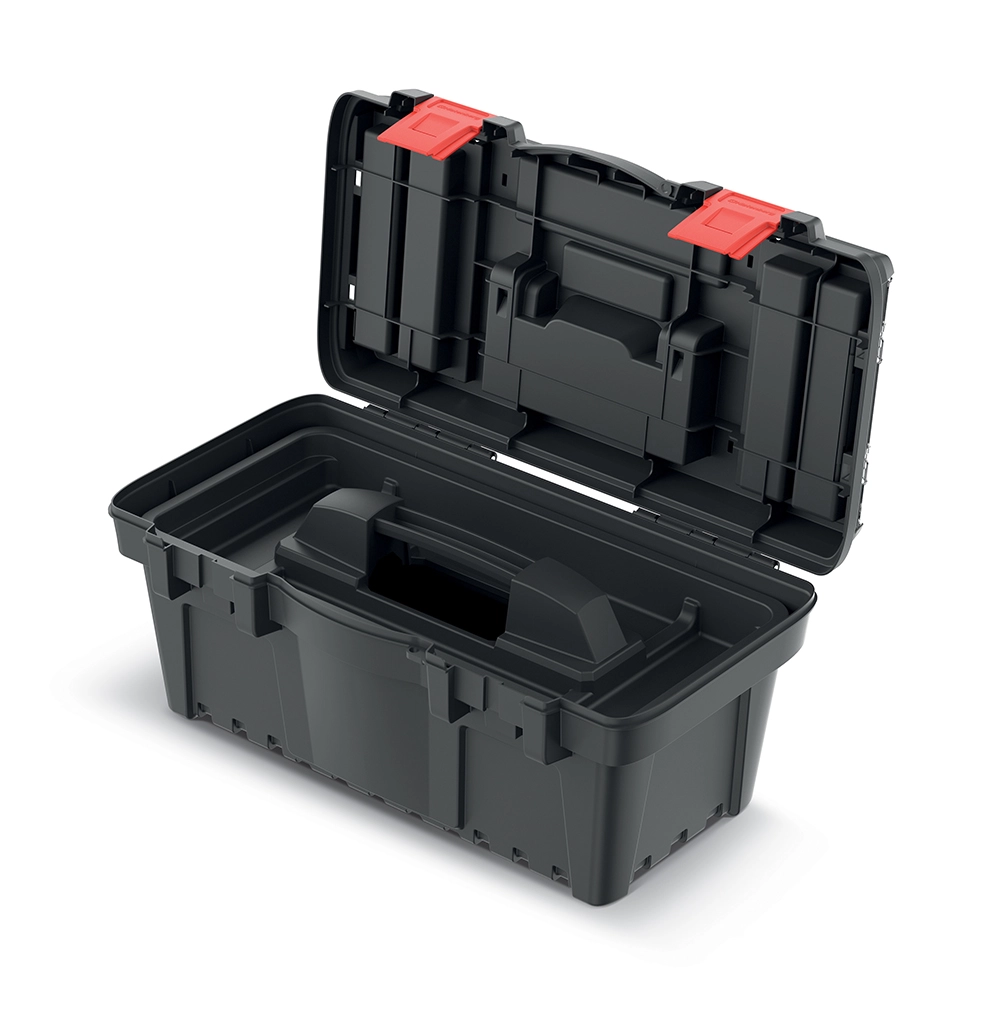 Premišljene podrobnosti, kot so predelki v pokrovu in škatlice za drobne dele, prihranijo čas in prostor. Ergonomski ročaj iz ABS lepo sede v dlan in olajša prenos, medtem ko čvrsta plastična zapirala med ravnanjem in prevozom varno zadržijo vsebino.