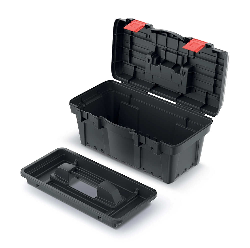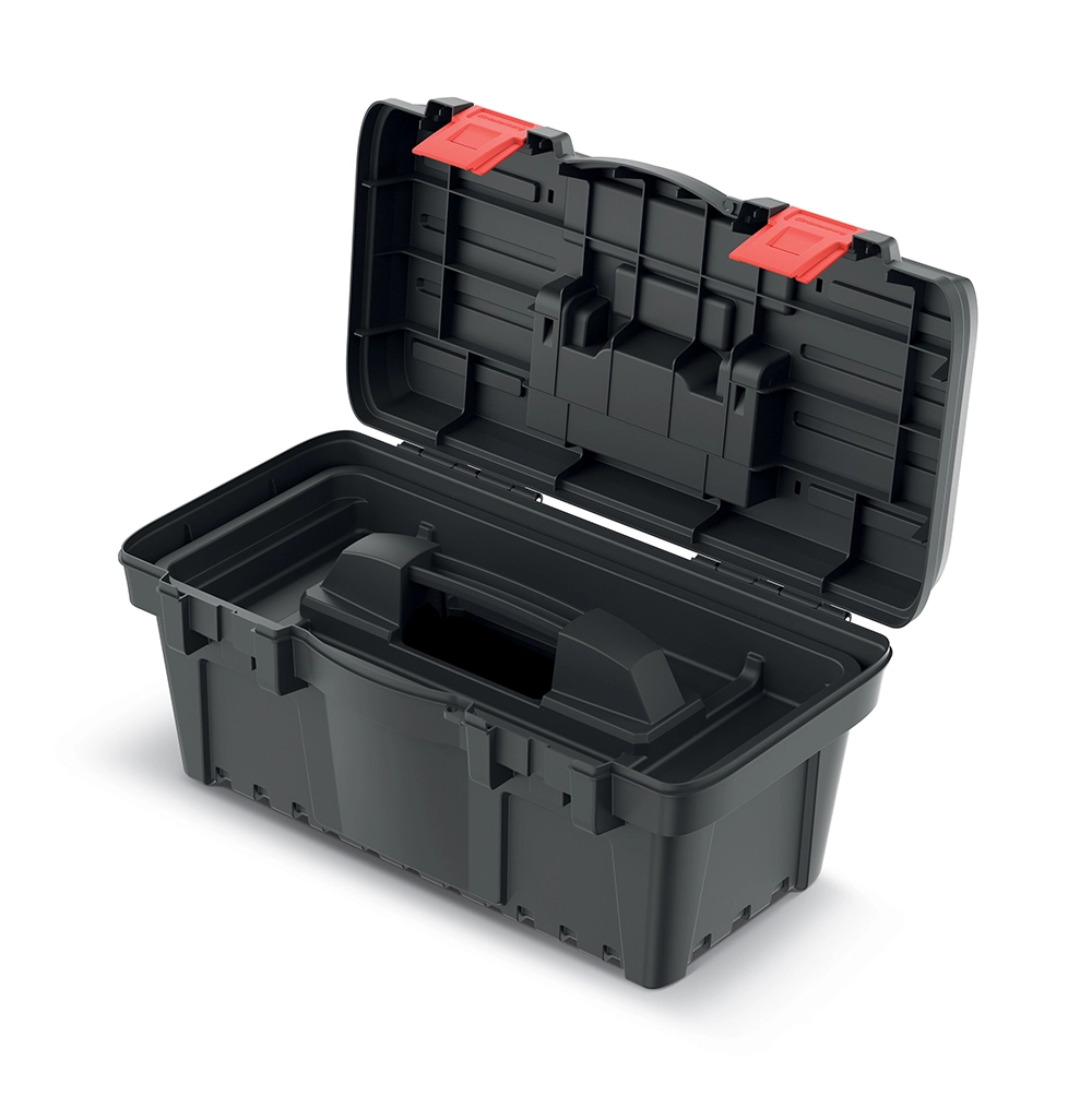 Vgrajena odstranljiva pregrada omogoča hiter dostop do manjših delov, medtem ko čvrsta plastika, ojačani robovi in zanesljive ABS zaponke ščitijo vsebino med prevozom. Ergonomski ročaj olajša rokovanje in zagotavlja zanesljiv oprijem tudi pri polni obremenitvi do 12 kg.