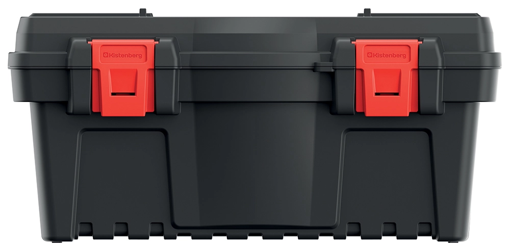 Dve robustni rdeči zaponki držita pokrov trdno zaprt, zato se orodje med prenašanjem ne zrahlja in ne razsuje.