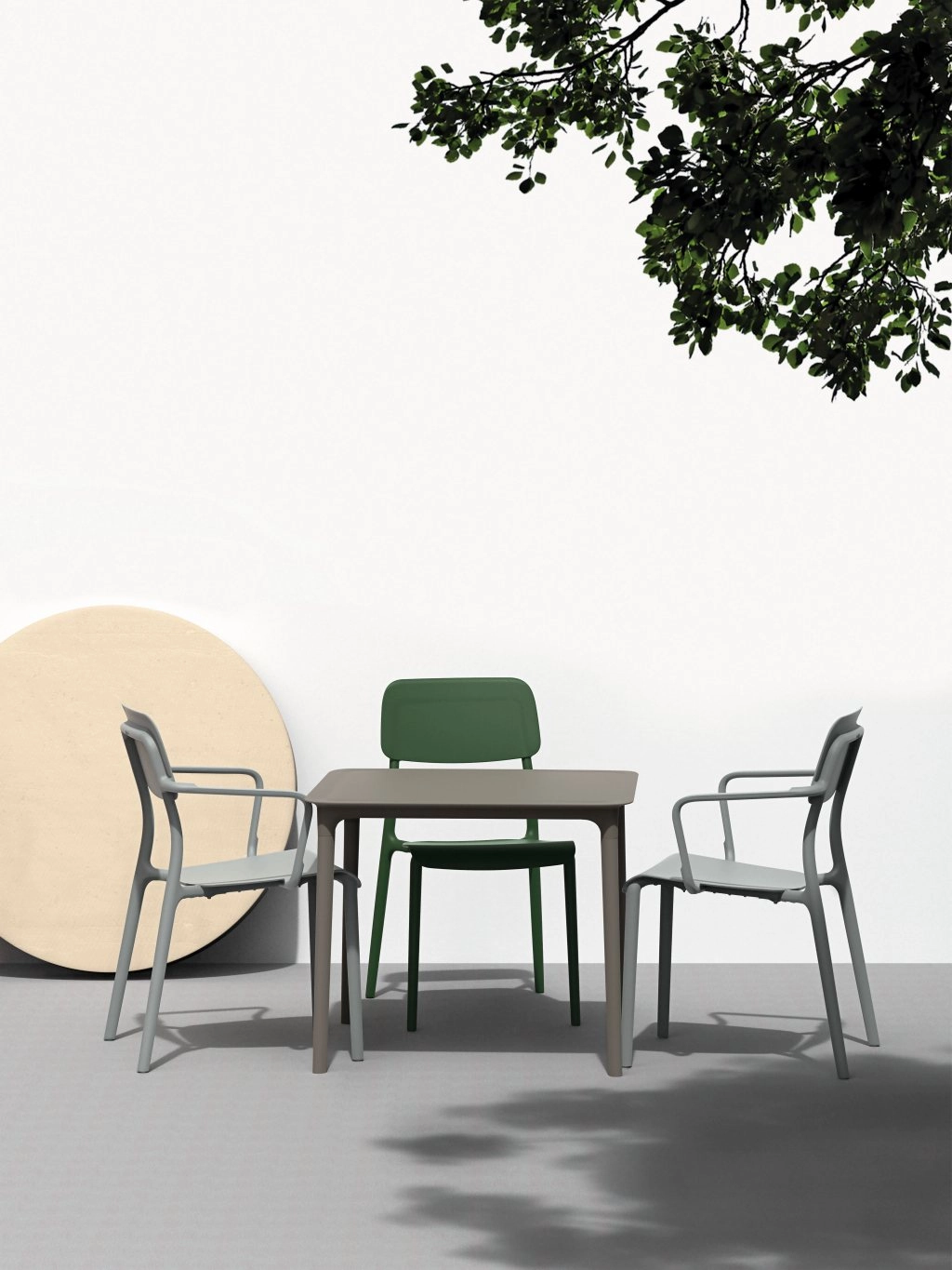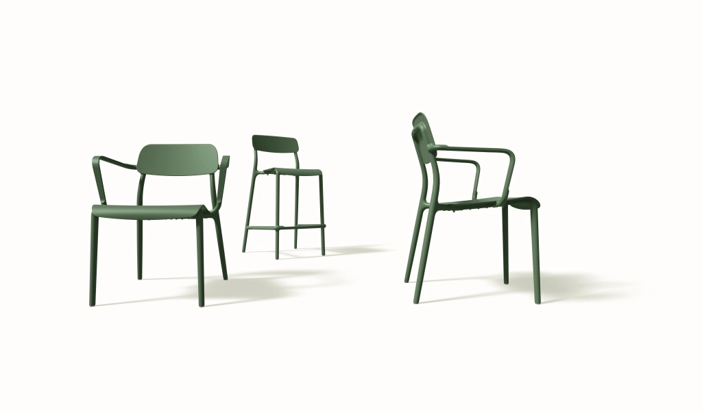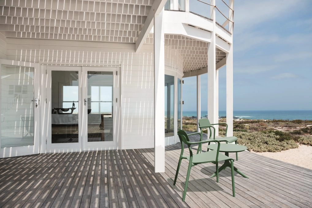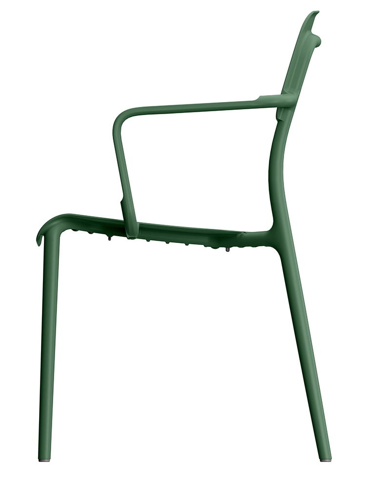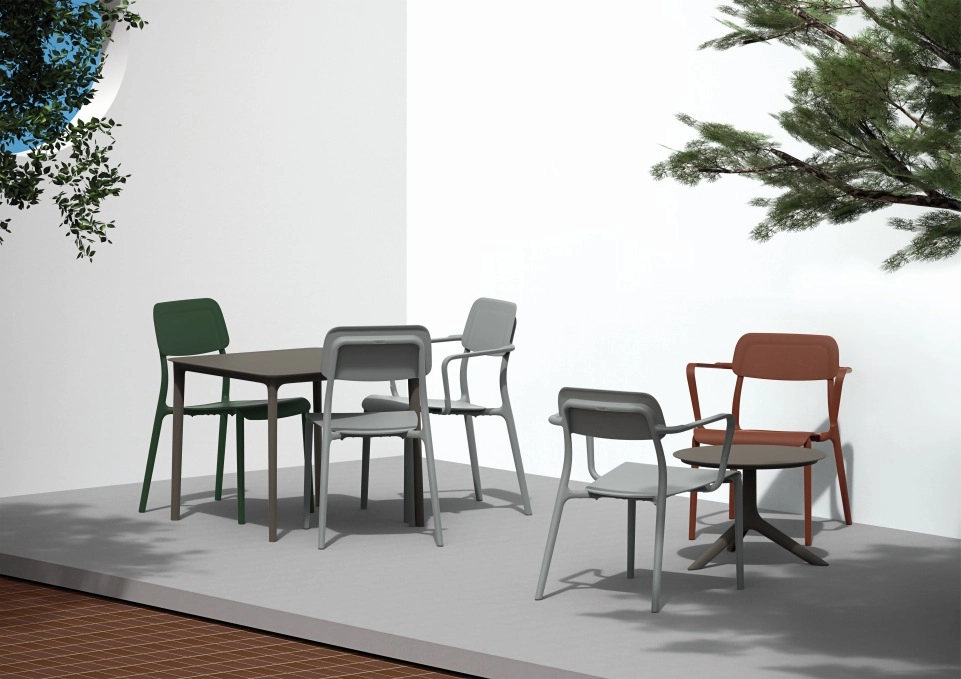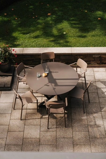 Vgrajeni nasloni za roke in ergonomsko oblikovan sedež podpirajo pravilno držo telesa in udobje tudi pri daljšem sedenju – idealno za mizo ali teraso.