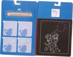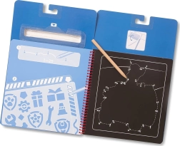 Pod črno plastjo se skrivajo živi motivi TAČKE NA PATRULJI. Otroci zlahka ustvarijo privlačne slike brez barv ali lepila.