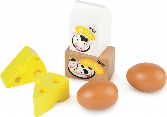 Otroška lesena škatla TIDLO prinaša mlečne izdelke in jajca z kmetije v trdnem zabojčku z ročaji. Odlična za igro trgovine in kuharjev, razvija ustvarjalnost in domišljijo. Vsebuje 2 jajci, 2 rezini sira, maslo in mleko. Izdelano iz kakovostnih materialov iz odgovornih virov, izpolnjuje evropske varnostne standarde.