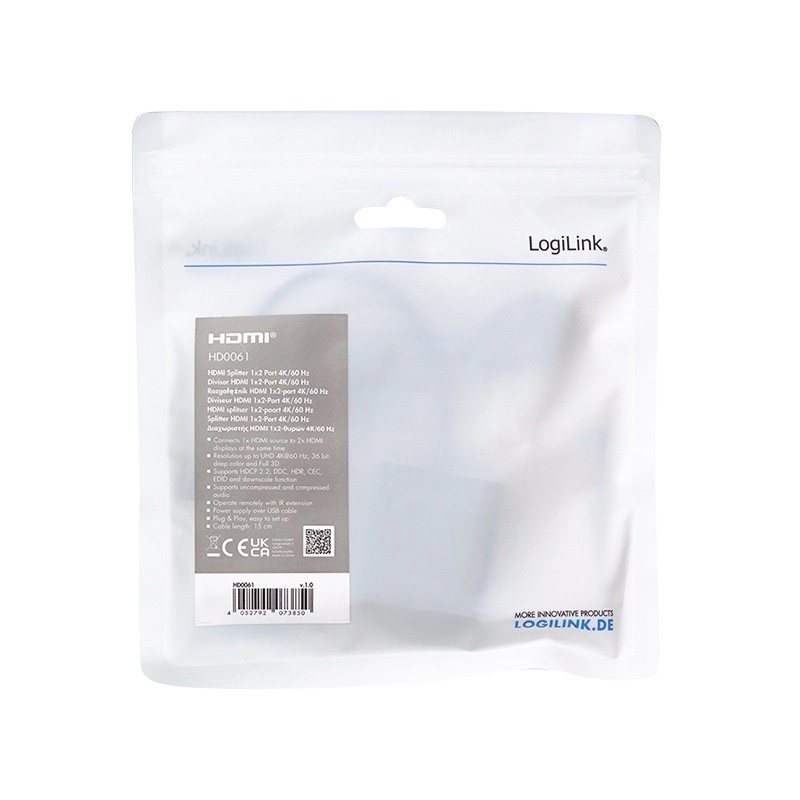 HDMI razdelilnik znamke LogiLink razdeli signal iz enega vira na dva zaslona v kakovosti 4K UHD pri 60 Hz. Brez preklapljanja kablov – idealno za predstavitve, razstavne prostore, trgovine, restavracije in domači kino. Zahvaljujoč podpori IR vmesnika lahko razdelilnik in televizor upravljate z daljinskim upravljalnikom (izbirno).