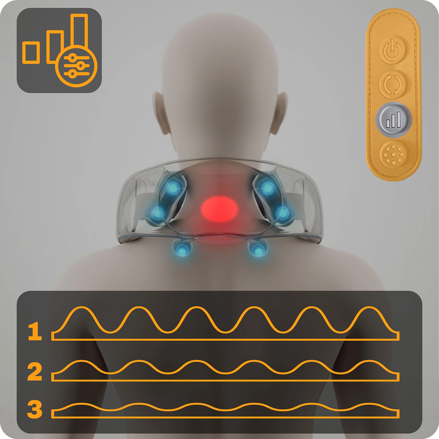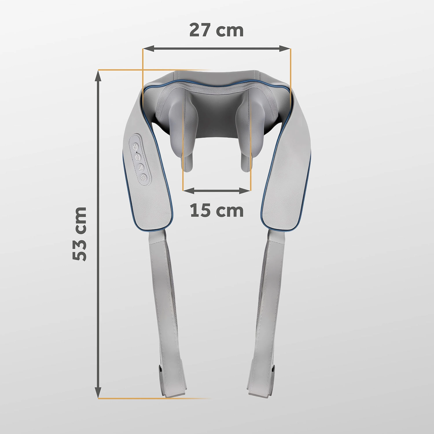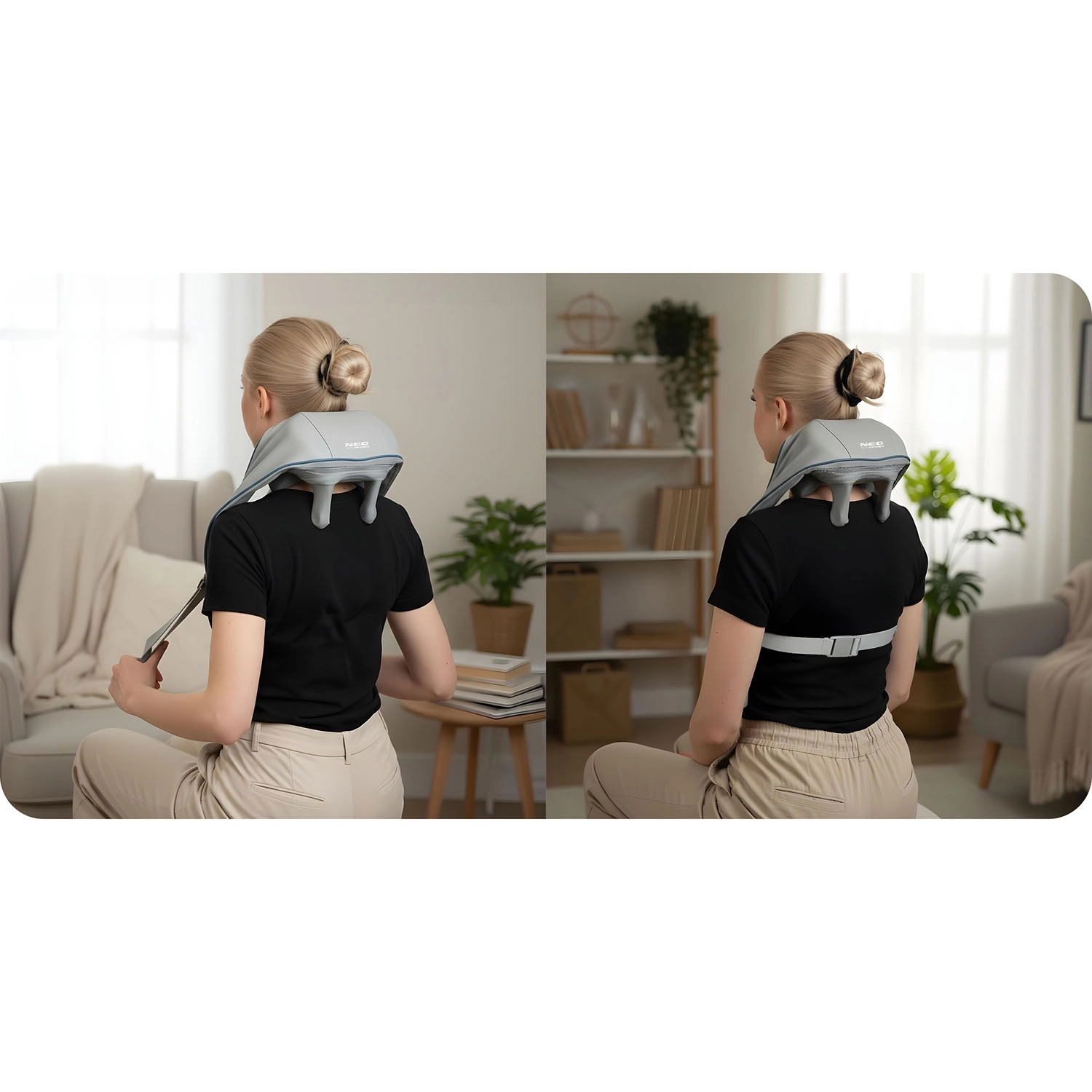 Intuitivna plošča vam omogoča z enim dotikom preklapljati med 3 stopnjami intenzivnosti, smerjo vrtenja in gretjem. Z nastavljivimi trakovi preprosto prilagodite pritisk – lahko ročno povlečete ali uporabite zadnji trak za prostoročno sprostitev. Naprava je idealna za vrat in tilnik, ramena, hrbet in ledveni del, pa tudi za stegna in meča po športu ali dolgem sedenju.