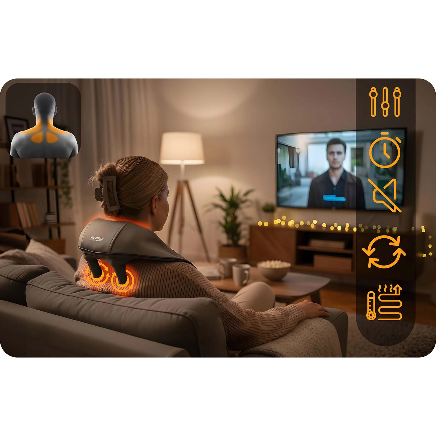 Doživite masažo kot iz rok profesionalca. Ta ergonomski masažni aparat zvesto posnema tehniko shiatsu – globinsko gnetenje učinkovito sprosti vratno hrbtenico, trapez, lopatice in ledveni del. Gretje spodbuja cirkulacijo krvi, zmehča toge mišice in poveča učinek sproščanja, medtem ko brezžična zasnova in polnjenje prek USB‑C prinašata svobodo uporabe.