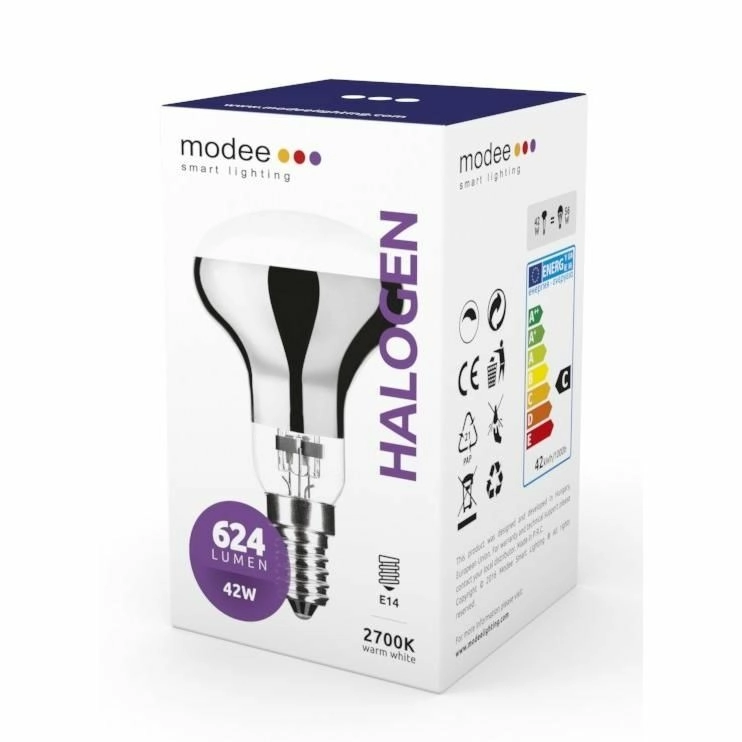 Varčna halogenska žarnica R50 z navojem E14 in močjo 42 W ponuja takojšen poln sij, zatemnljivo svetlobno moč 624 lm in toplo belo svetlobo 2700 K. Zahvaljujoč širokemu kotu snopa 120° odlično osvetli prostor, posebna zasnova z IR-odbojem pa povečuje učinkovitost. Energetski razred C, življenjska doba do 2000 h.
