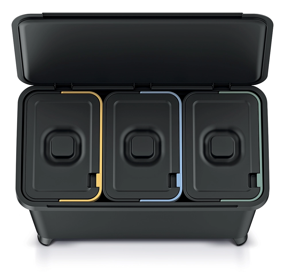 Tri samostojne vložke (rumena/plastika, modra/papir, zelena/steklo) z pokrovi in barvnimi robovi pospešijo pravilno ločevanje in ohranjajo red v gospodinjstvu.