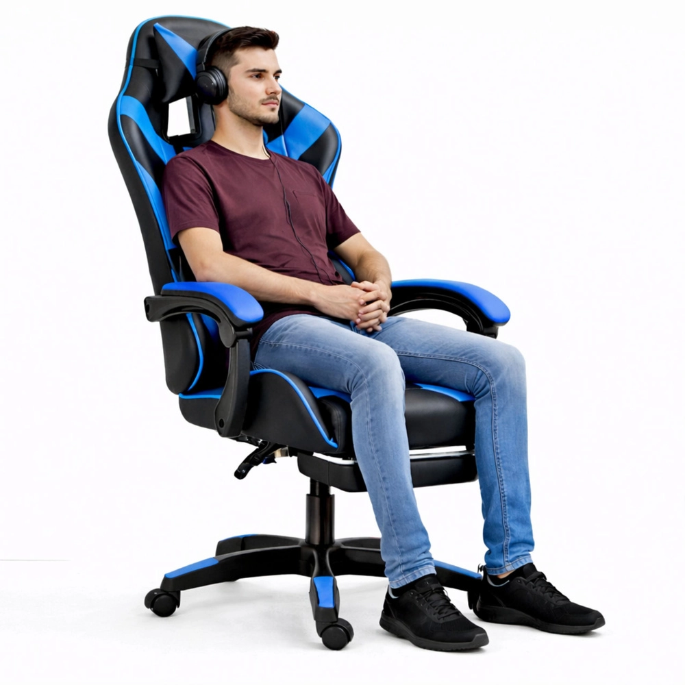 Ergonomski igralni stol LEAN v elegantni črno‑modri kombinaciji ponuja visok naslonjalo z vzglavnikom in ledveno oporo, nagib naslonjala do 135°, nastavitev višine in izvlečno oporo za noge za maksimalno udobje pri igranju in delu. Trpežno eko usnje, vrtljiva osnova 360° in stabilno petkrako križno podnožje s kolesi zagotavljajo udobje in enostavno premikanje tudi med dolgotrajnim sedenjem.