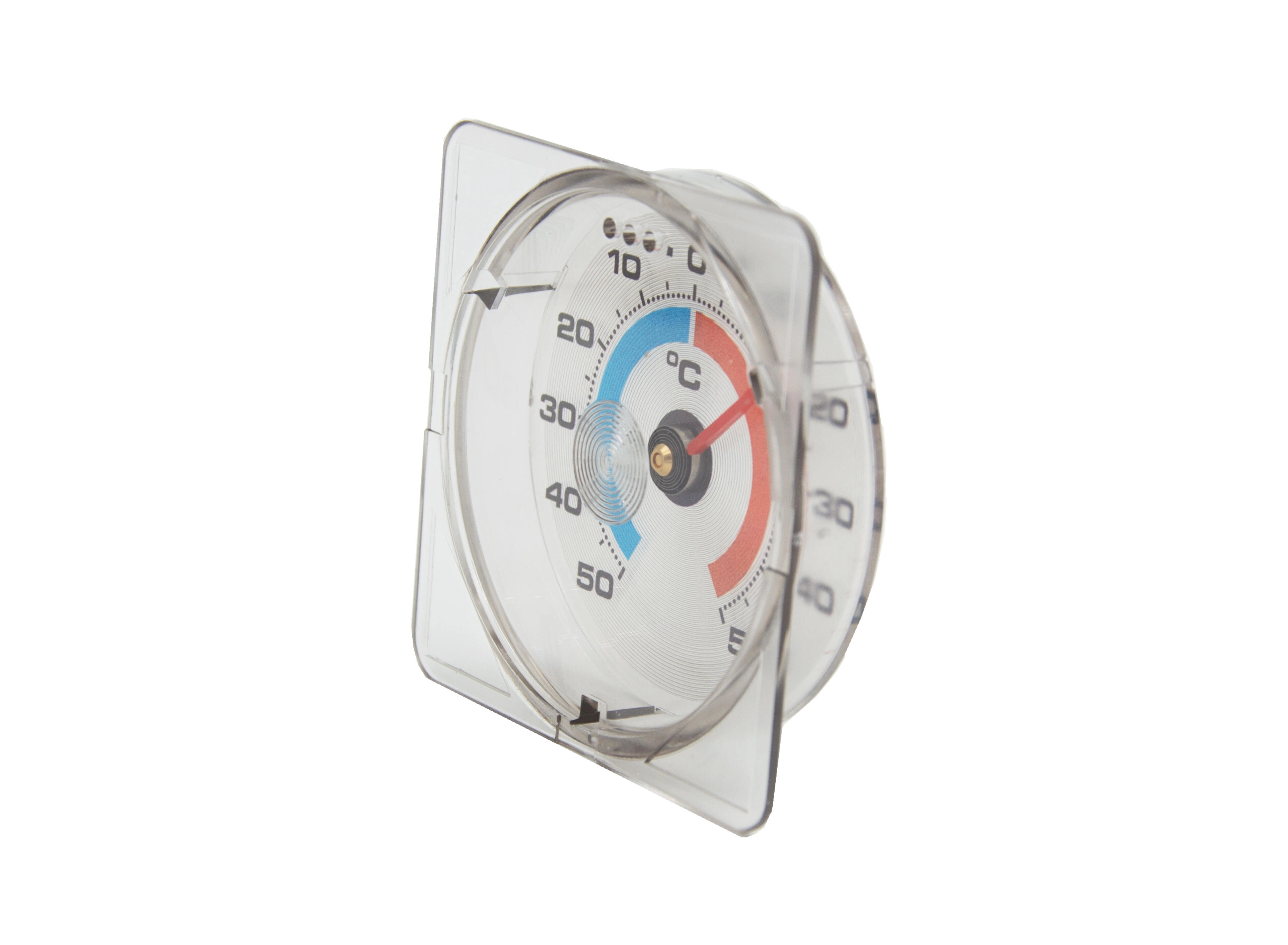 Praktičen okenski termometer za zunanjo uporabo z jasno lestvico in lepilnim kvadratkom za enostavno namestitev. Ponuja merilno območje od -50 do +50 °C, kompaktne mere 7×7 cm in lahko plastično ohišje za dolgo življenjsko dobo.