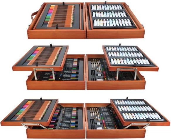 Vsebuje 177 kakovostnih orodij, primernih za otroke in odrasle, vključno z barvicami, flomastri in različnimi vrstami barv.