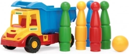 Kamion z nagibnim kesonom Multi Truck s premično tovorno kabino ponuja zabavo za naše male otroke. Vključuje set za kegljanje s 5 barvnimi kegljami in kroglo.