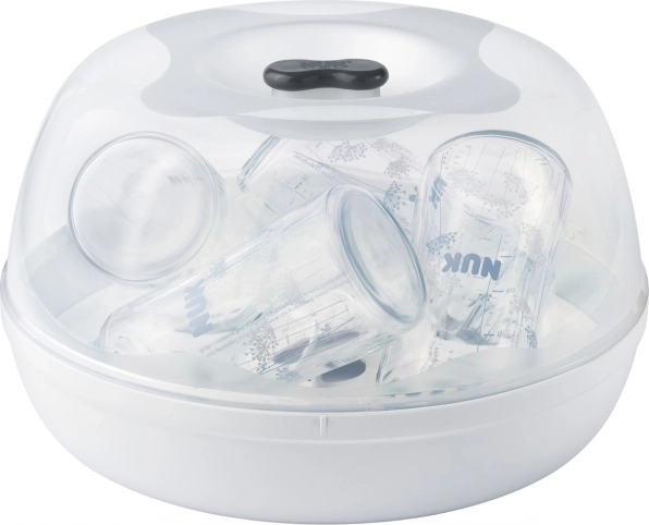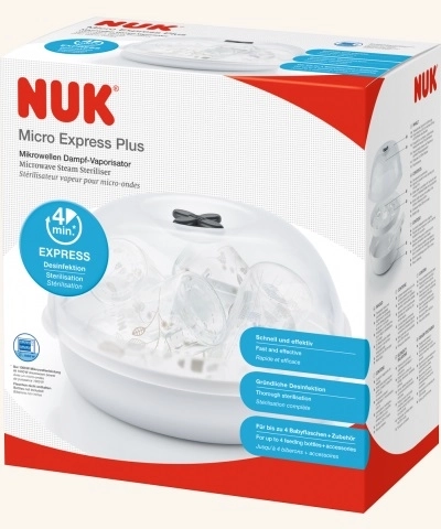 Praktičen in hiter pomočnik za vsakodnevno higieno dojenčkovih pripomočkov: NUK Micro Express Plus s pomočjo pare sterilizira do štiri stekleničke in dodatke že v 4 minutah. Ponuja preprosto uporabo, združljivost z večino standardnih mikrovalovnih pečic ter varno jemanje zahvaljujoč praktičnim kleščam.