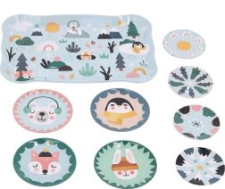 V škatli najdete vse za popolno čajanko: velik pladenj za enostavno serviranje, 4 skodelice s krožnički, 4 desertne krožnike in čajnik s pokrovom. Deli so lahki, trpežni in enostavni za vzdrževanje. Dizajn Michelle Carlslund s prijaznimi živalicami spodbuja otroško domišljijo ter nežno razvija socialne veščine pri skupni igri.