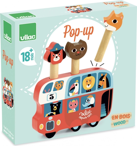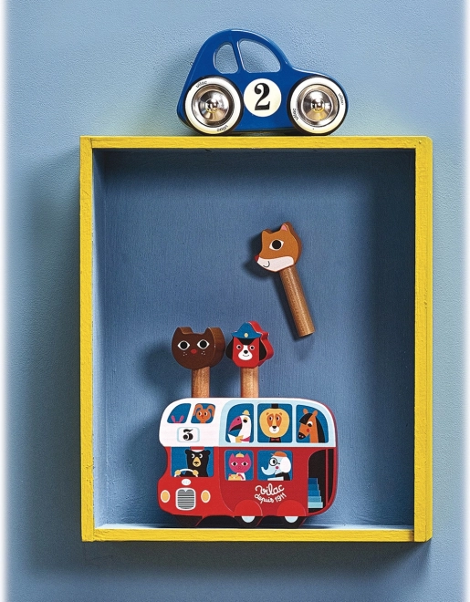 Vilac Lesena izstrelitvena igra Avtobus z živalmi je čudovita igrača z ilustracijami znane umetnice Ingele P. Arrhenius. Tri ljubke figurice – lisica, kuža in mačka – izskočijo iz avtobusa, kar zagotovo zabava otroke.
