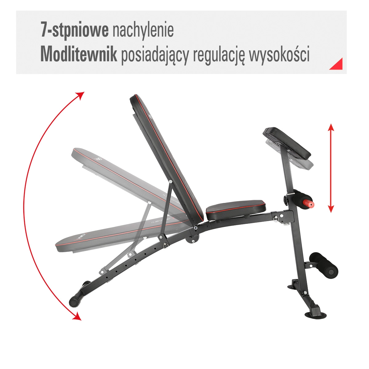 Robustna jeklena konstrukcija z nosilnostjo 150 kg in stabilizatorji z gumijastimi čepki zagotavljajo zanesljivost pri vsakem ponovitvi. Klop je mogoče preprosto zložiti, nizka masa 9,5 kg pa omogoča lahko prenašanje in shranjevanje. Oblazinjenje iz sintetičnega usnja z nedrsečo površino povečuje udobje in higieno med vadbo, medtem ko praktične zanke na sprednji nogi omogočajo priklop priloženih gumijastih ekspanderjev za raznolik trening rok.