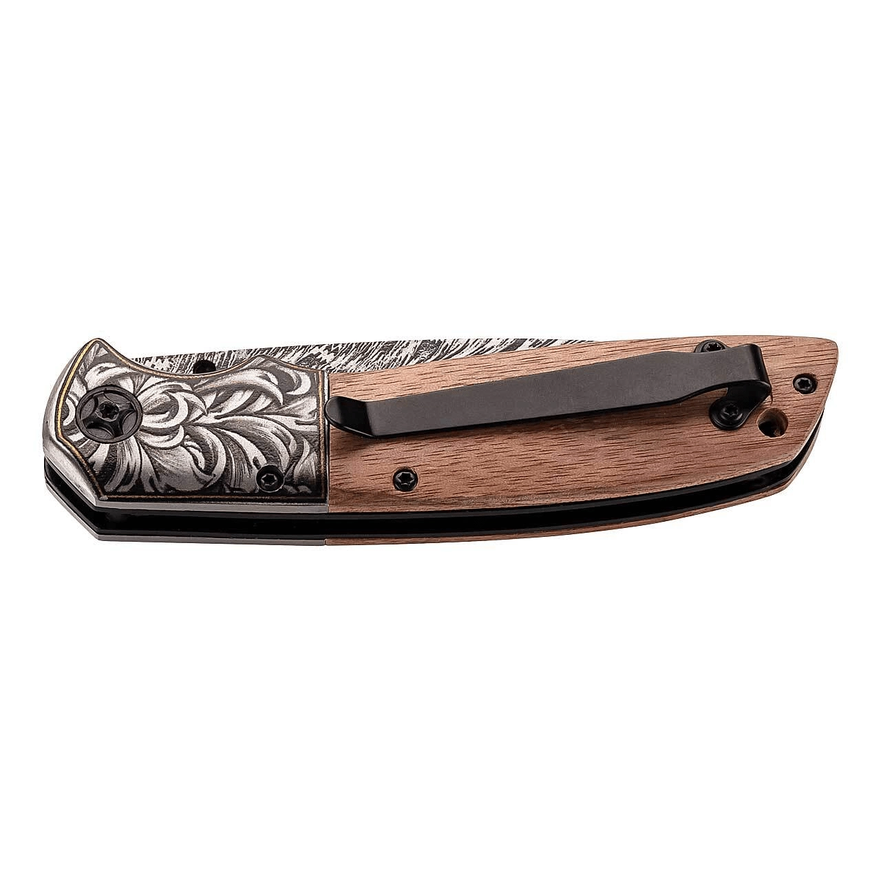 Eleganten žepni nož HERBERTZ za vsakodnevno uporabo ali kot stilsko darilo. Ponuja rezilo iz nerjavnega jekla AISI 420 z graviranim cvetličnim motivom, udobno odpiranje s palčnim zatičem in varno zaklepanje Linerlock. Ročaj iz orehovega lesa odlično sede v roko, ne manjka žepna sponka za nošenje na desni strani in odprtina za vrvico.