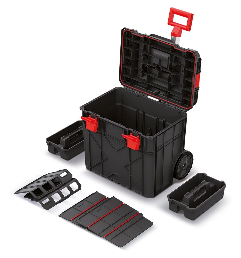 Vozni kovček X-Block Tech združuje trdno konstrukcijo, pametno organizacijo in enostaven prevoz. Rebraste stene, ojačani vogali in kakovostna zapirala ščitijo vsebino tudi v prašnem ali vlažnem okolju. Zahvaljujoč teleskopskemu ročaju in velikim, vzdržljivim kolesom boste orodje varno premikali po delavnici in na gradbišču.