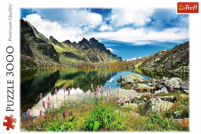 Prikazuje spokojno Starolesniansko jezero z odsevom tatriških vrhov, cvetjem v ospredju in kristalno čisto vodo.