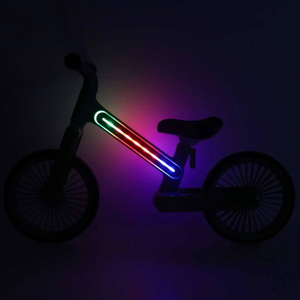 Izberite slog osvetlitve od nežnih pulzov do mavričnih prehodov. En sam gumb pod okvirjem vklopi luči in preklaplja učinke – otrok je bolje viden in bolj uživa v vožnji.