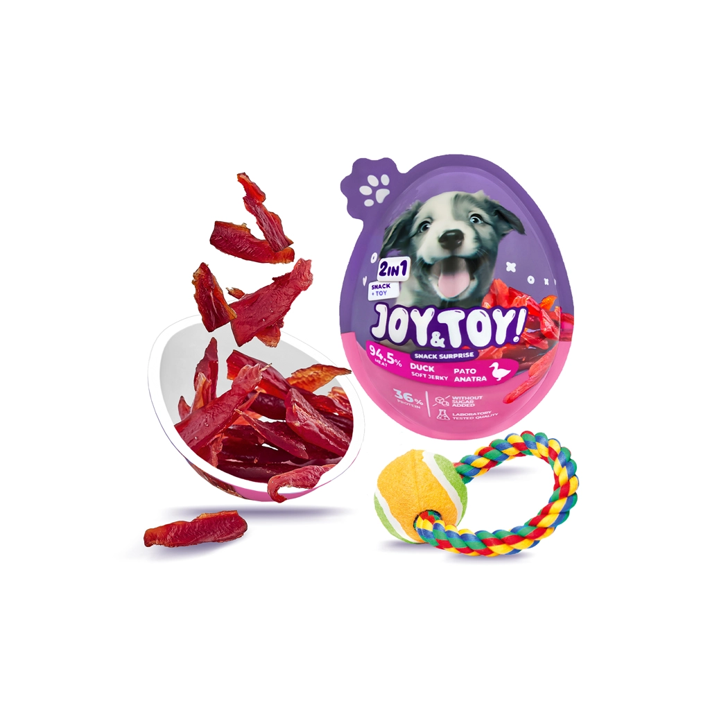 Jajce Joy&Toy prinaša dvojno veselje: premium mesni prigrizek in kakovostno igračo za pse (nekatere različice bodo razveselile tudi mačke). Mehki račji jerky z visokim deležem mesa ponuja naraven okus in vonj, je bogat z beljakovinami in izdelan s skrbno nadzorovanim sušenjem. Vsako jajce skriva drugo igračo – od dentalnih prek gumi do plišastih – za zabavo, trening in sprostitev.
