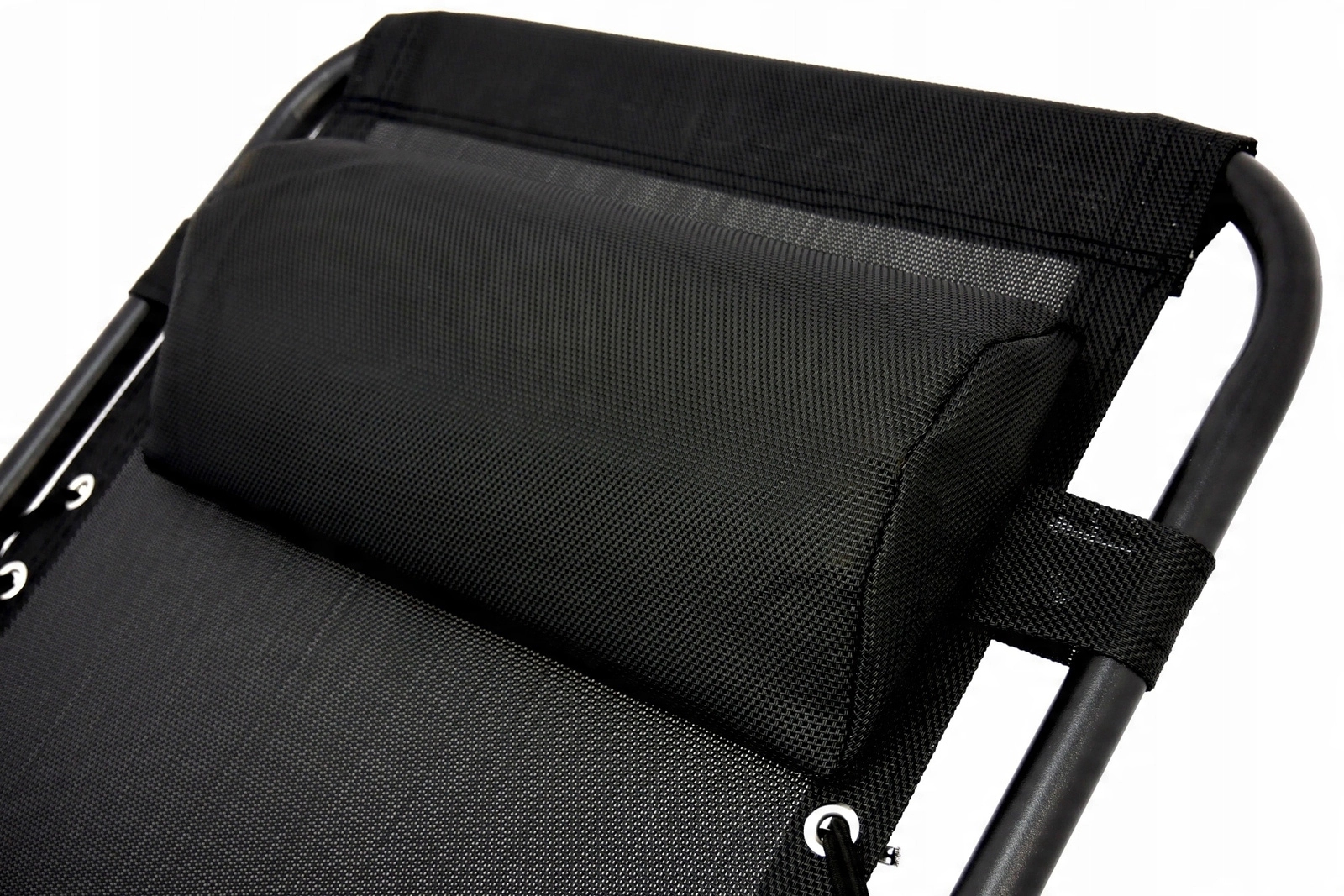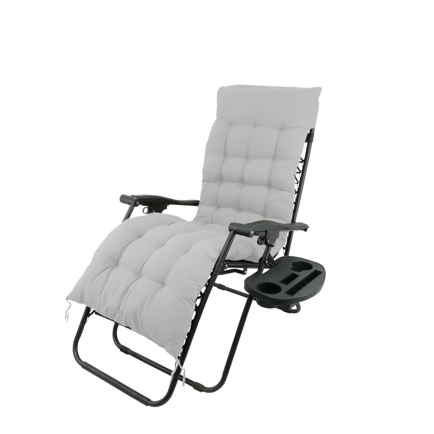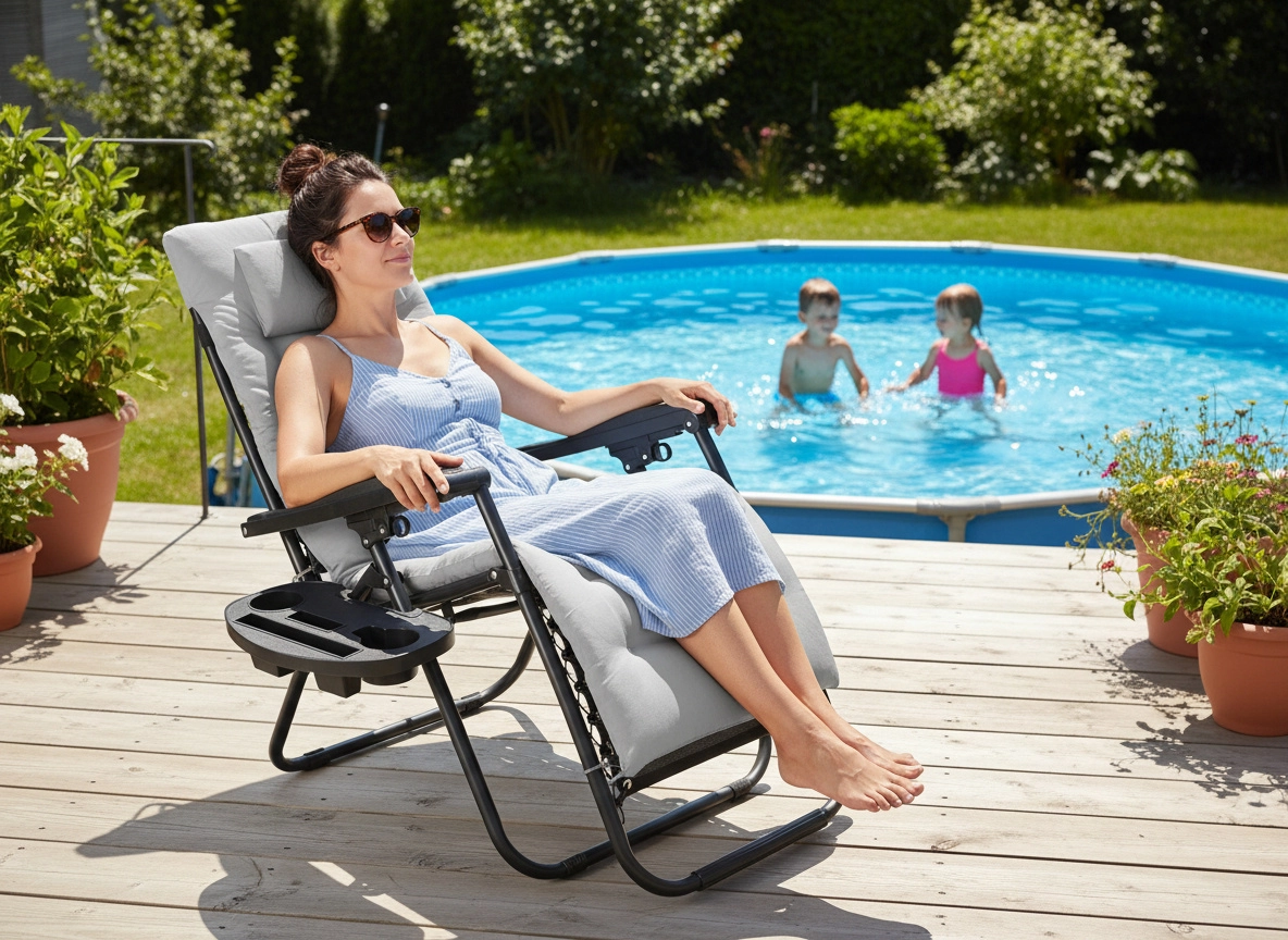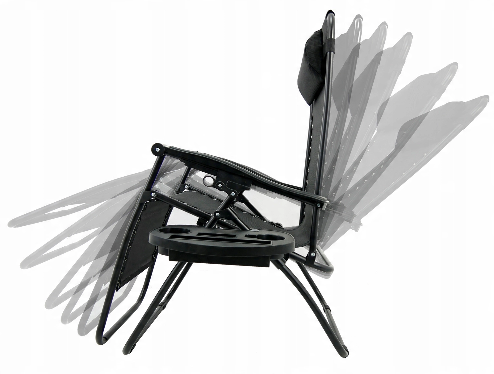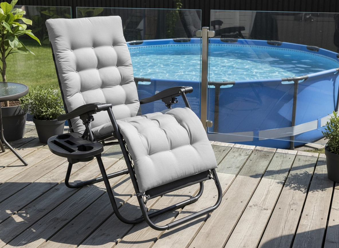 Uživajte v udobju in sprostitvi na prostem s stilskim ležalnikom s črnim kovinskim okvirjem in sivim vzglavnikom. Zahvaljujoč zložljivi konstrukciji, nemotni nastavitvi naklona in stranski mizici za pijačo in telefon je idealen za vrt, teraso in balkon. Za največje udobje ne manjkata odstranljiv oporni vzglavnik in protizdrsni zaključki za stabilnost.