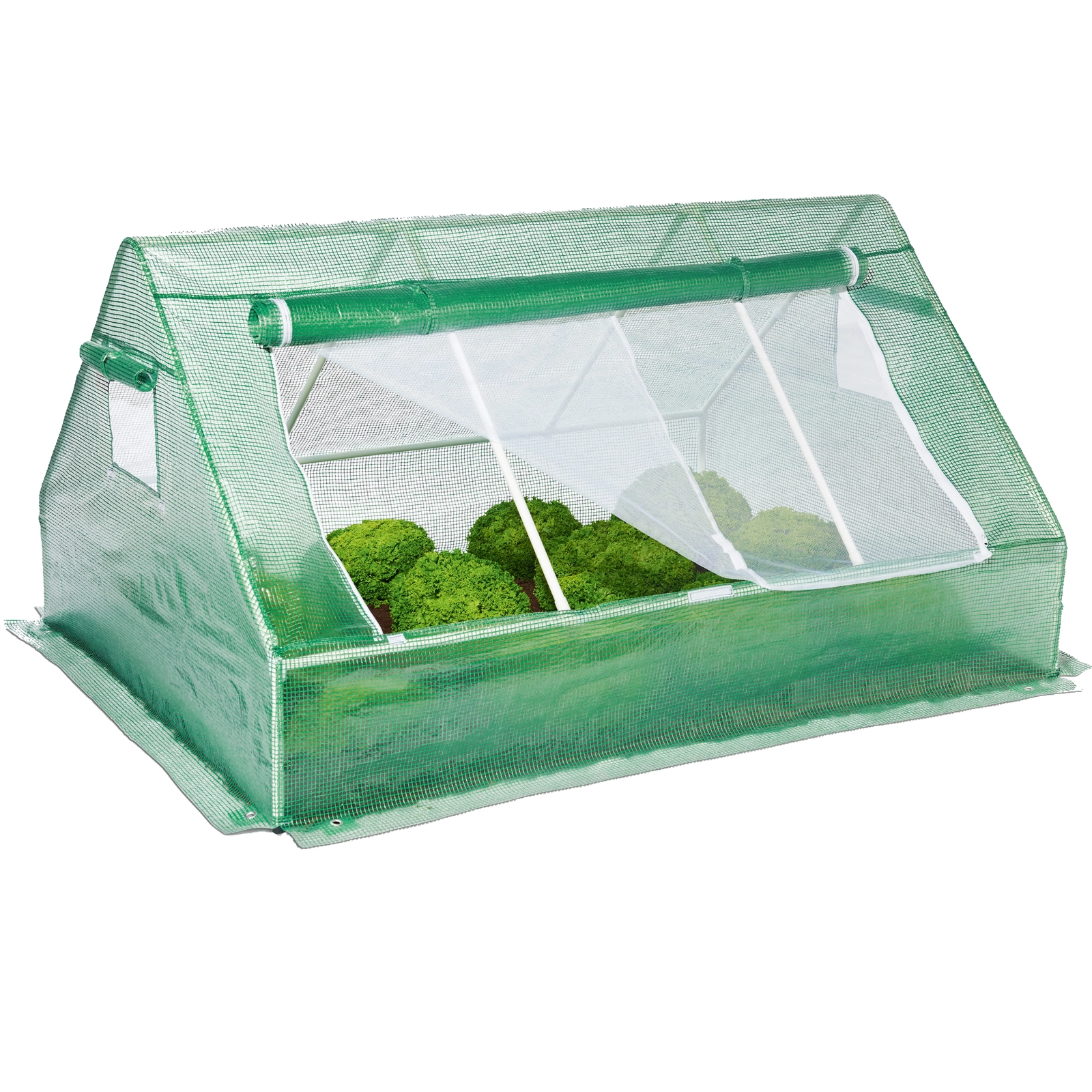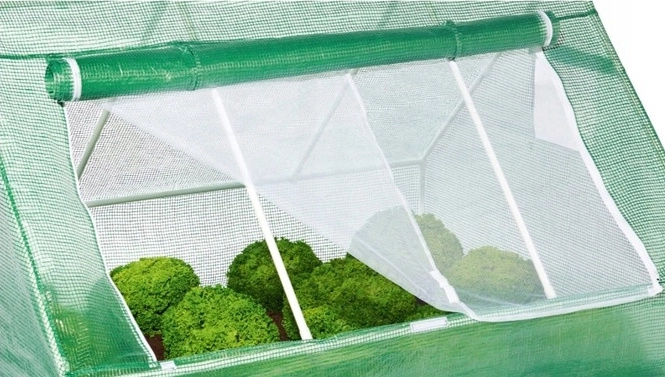 Za enostavno upravljanje ne manjkata zložljiv čelni panel z zadrgo in prezračevalna okna s komarnikom, ki zagotavljajo kroženje zraka in hkrati ščitijo pred škodljivci. Spodnji talni rob lahko zasujete z zemljo za boljše sidranje in manj prepiha. Zaradi hitre in preproste montaže je primeren tudi za začetnike vrtnarjenja.