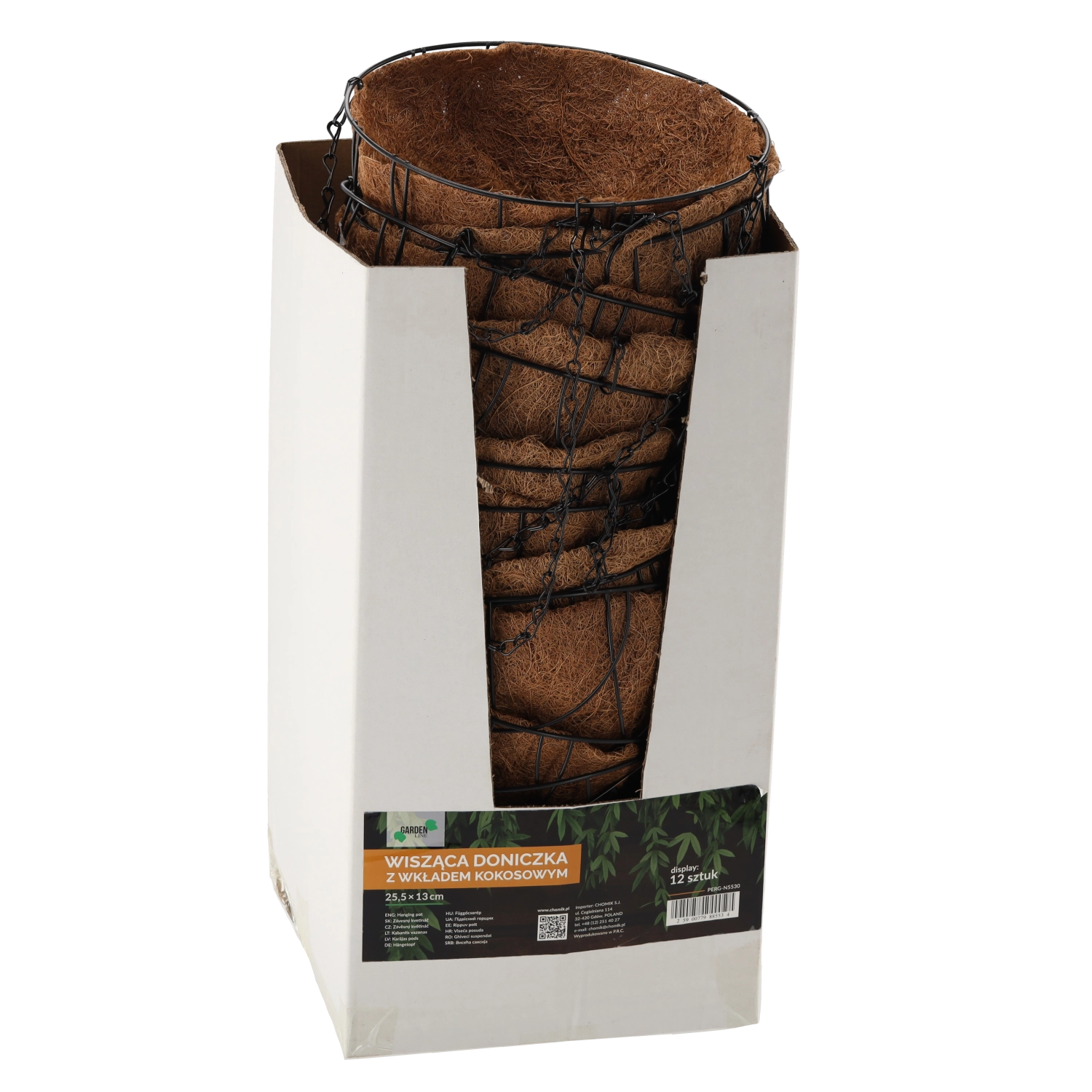 Stilski viseči cvetlični lonec z naravno kokosovo oblogo in trdno kovinsko konstrukcijo je idealen za balkone, terase in notranje prostore. Zračna kokosova obloga podpira zdravo rast in naravno drenažo, zato čudovito izstopajo viseče rastline, kot so petunije ali praproti. Enostavno obešanje prihrani prostor in ustvari dekorativen zeleni poudarek kjerkoli.
