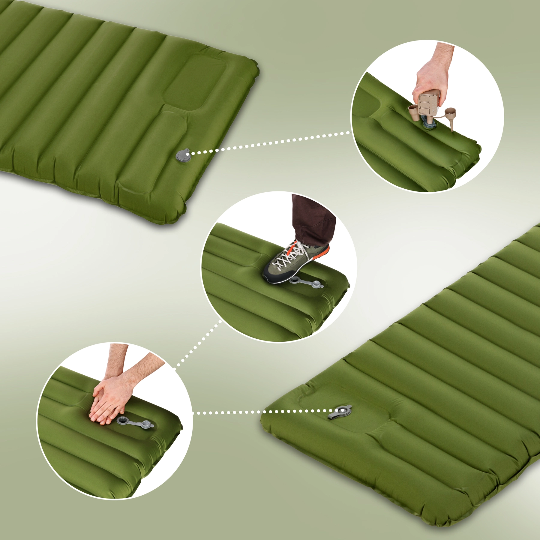 Konstrukcija iz poliestra 210T in TPU je lahka, trpežna in primerna za redno uporabo. Po uporabi podlogo preprosto izpraznite, zvijete in fiksirate z pritrdilnim trakom. Kompaktne mere po zlaganju in transportna vreča olajšajo prenašanje. V paketu najdete tudi komplet za popravilo za hitro sanacijo manjših poškodb na terenu.
