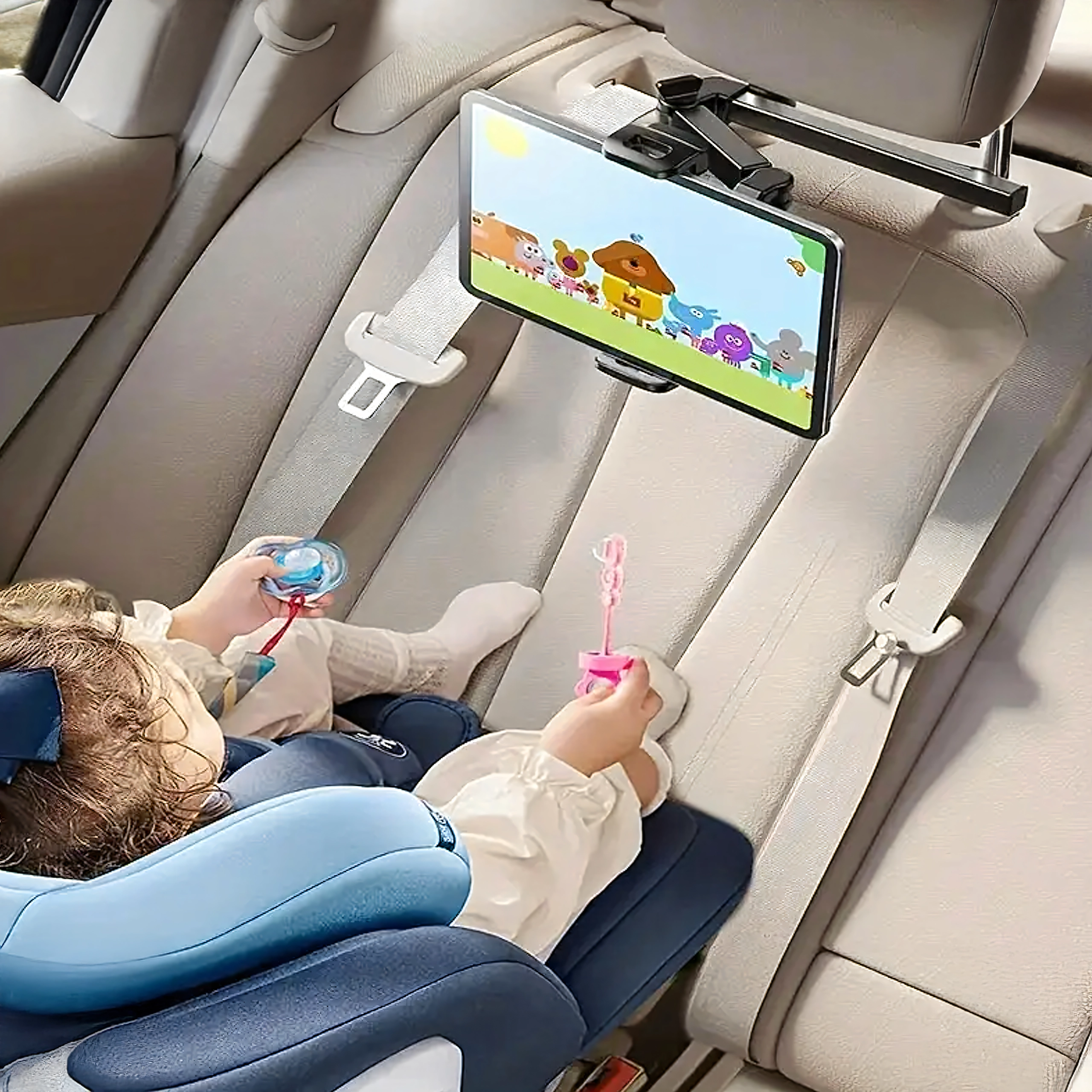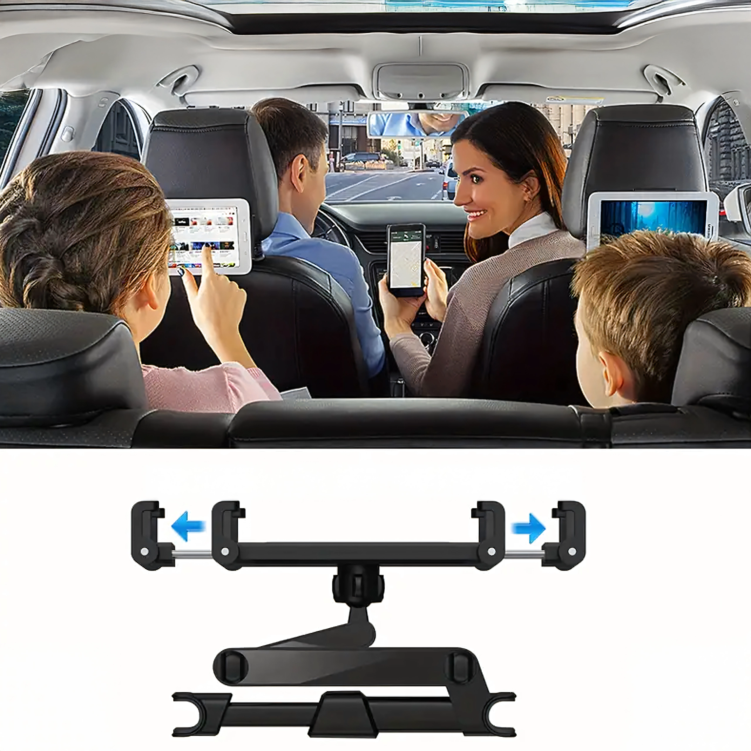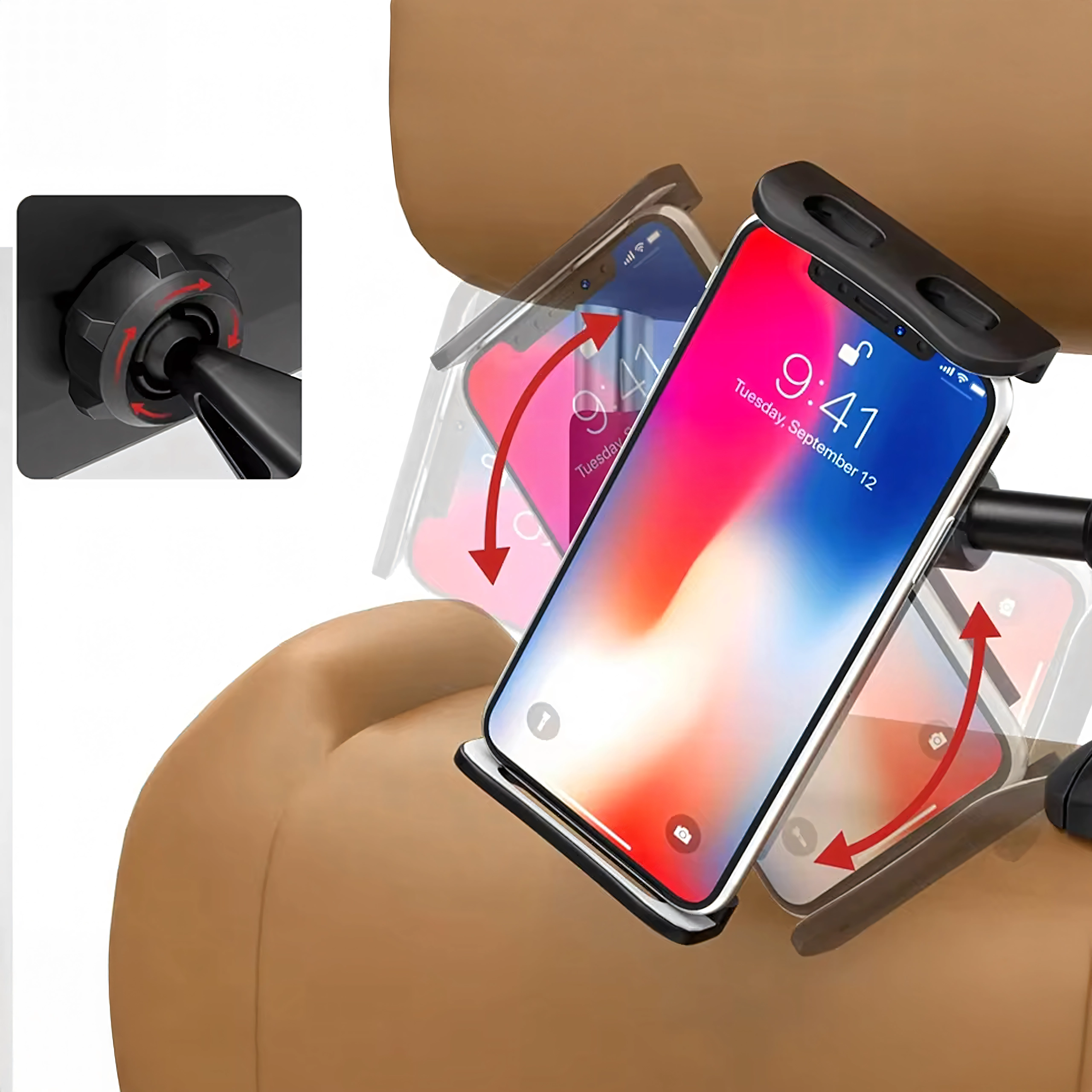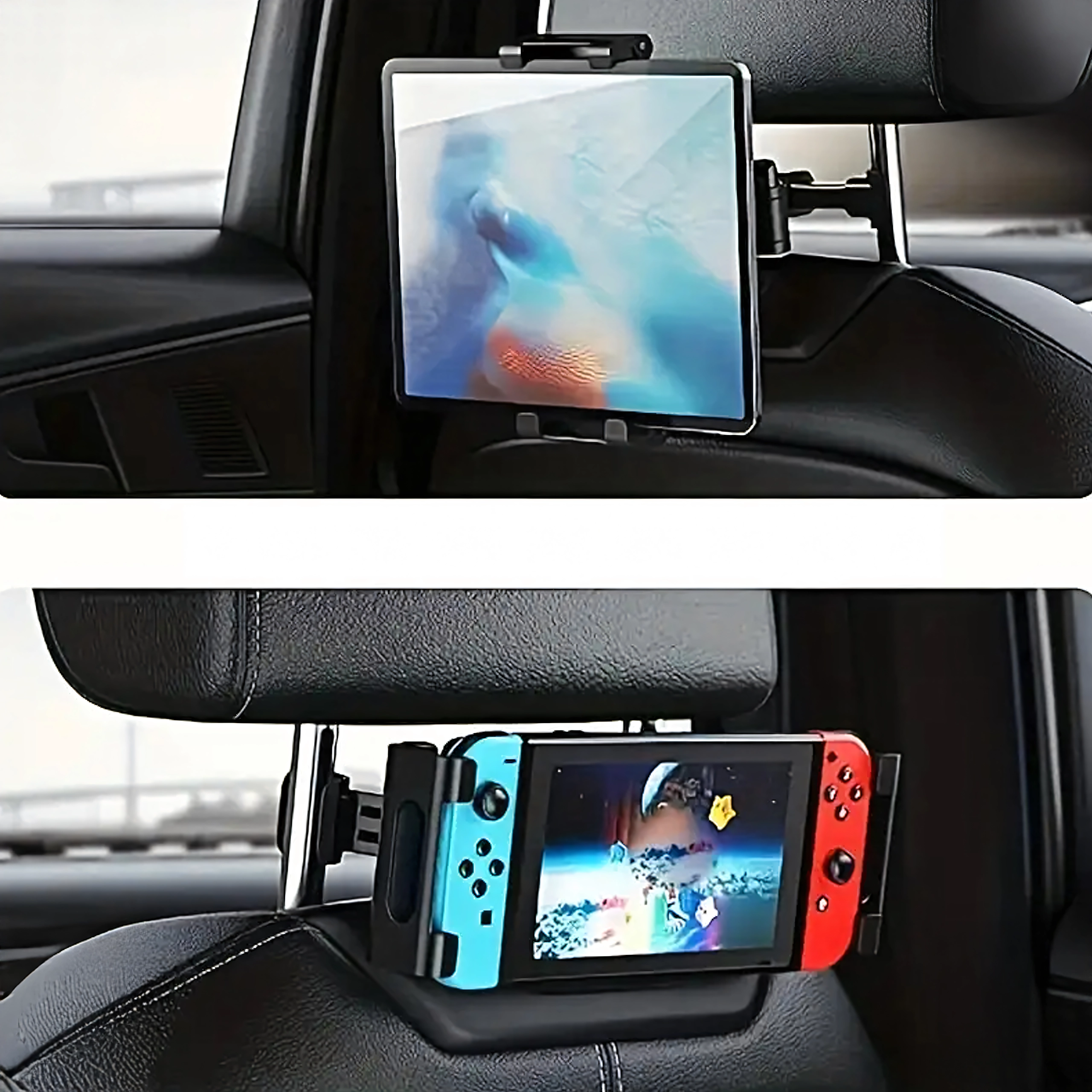 Univerzalni nosilec za vzglavnik spremeni zadnje sedeže v multimedijski kotiček. Zahvaljujoč členkasti zasnovi in krogličnemu zglobu ponuja vrtenje za 360°, široko združljivost s telefoni in tablicami ter trden oprijem brez tresenja – idealno za filme, igre in učenje na poti.