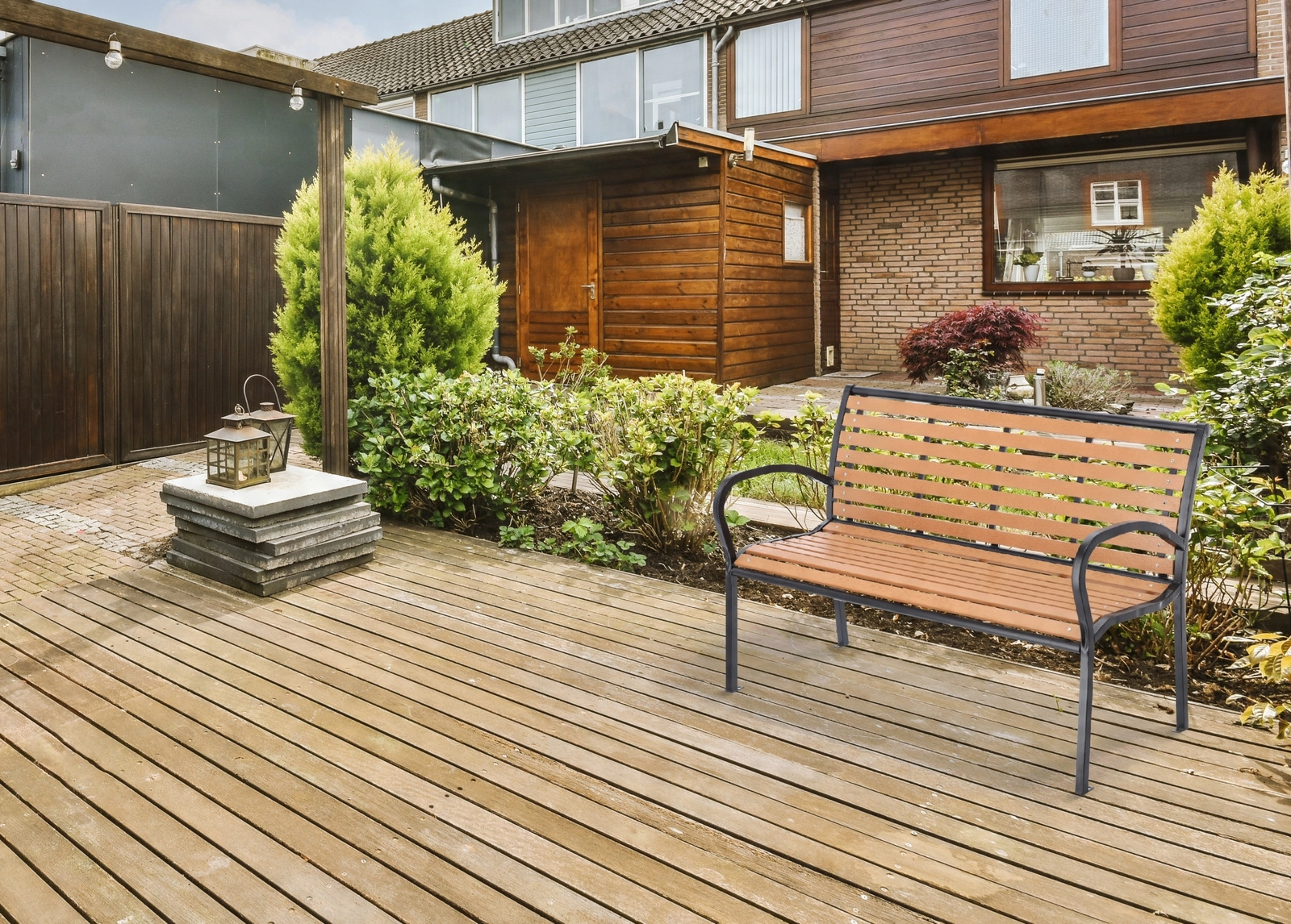 Plastične letvice v rjavem dekorju izgledajo kot les, vendar bolje prenašajo dež in sonce ter zahtevajo le minimalno vzdrževanje.
