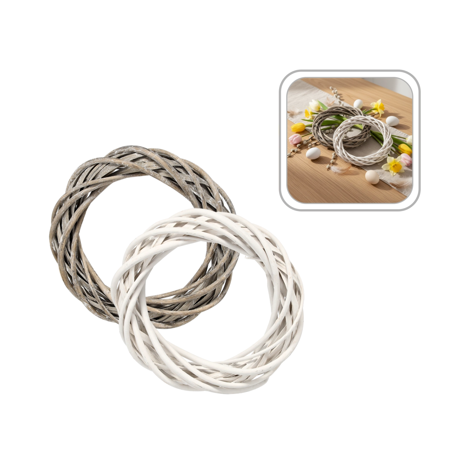 Ustvarite si izvirno dekoracijo v trenutku. Ta pleteni venček v brezčasnih nevtralnih odtenkih bele ali sive se poda tako v moderne kot rustikalne interierje. Je trden, lahek in pripravljen za okrasitev po vaši domišljiji – od spomladanskega cvetja prek jesenskega listja do božičnih okraskov.