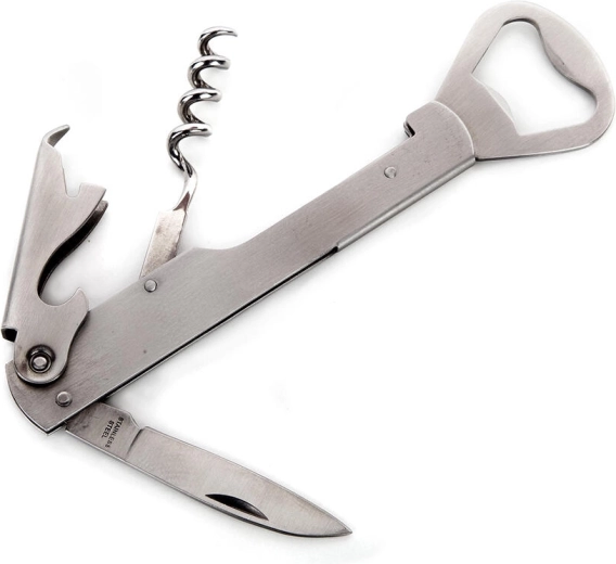 Ta veliki natakarski odpirač je zanesljiv pomočnik za vsakodnevno uporabo v restavracijah, barih in doma. Nerjavna izvedba nudi dolgo življenjsko dobo in enostavno vzdrževanje. Zaradi kombinacije vijačnika in ročice boste hitro in varno odprli steklenico s plutastim zamaškom ter pivo s kronskim zamaškom.