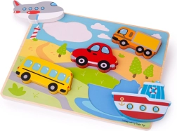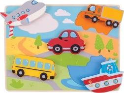 Odkrijte svet prometa na igriv način. Lesene vstavljanke z motivi letala, avtomobila, avtobusa, tovornjaka in ladje spodbujajo otroke k prepoznavanju oblik in barv ter hkrati razvijajo njihov besedni zaklad. Deli so dovolj veliki in prijetni za otroško roko.