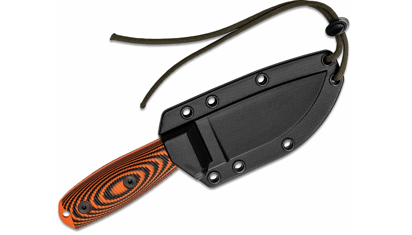 Ergonomski ročaj iz materiala G10 je teksturiran za čvrst in zanesljiv oprijem tudi z rokavicami ali v mokrem. Na koncu ročaja je odprtina za vrvico za dodatno zavarovanje. Del kompleta je črna kydex nožnica s sponko za udobno nošenje na pasu.