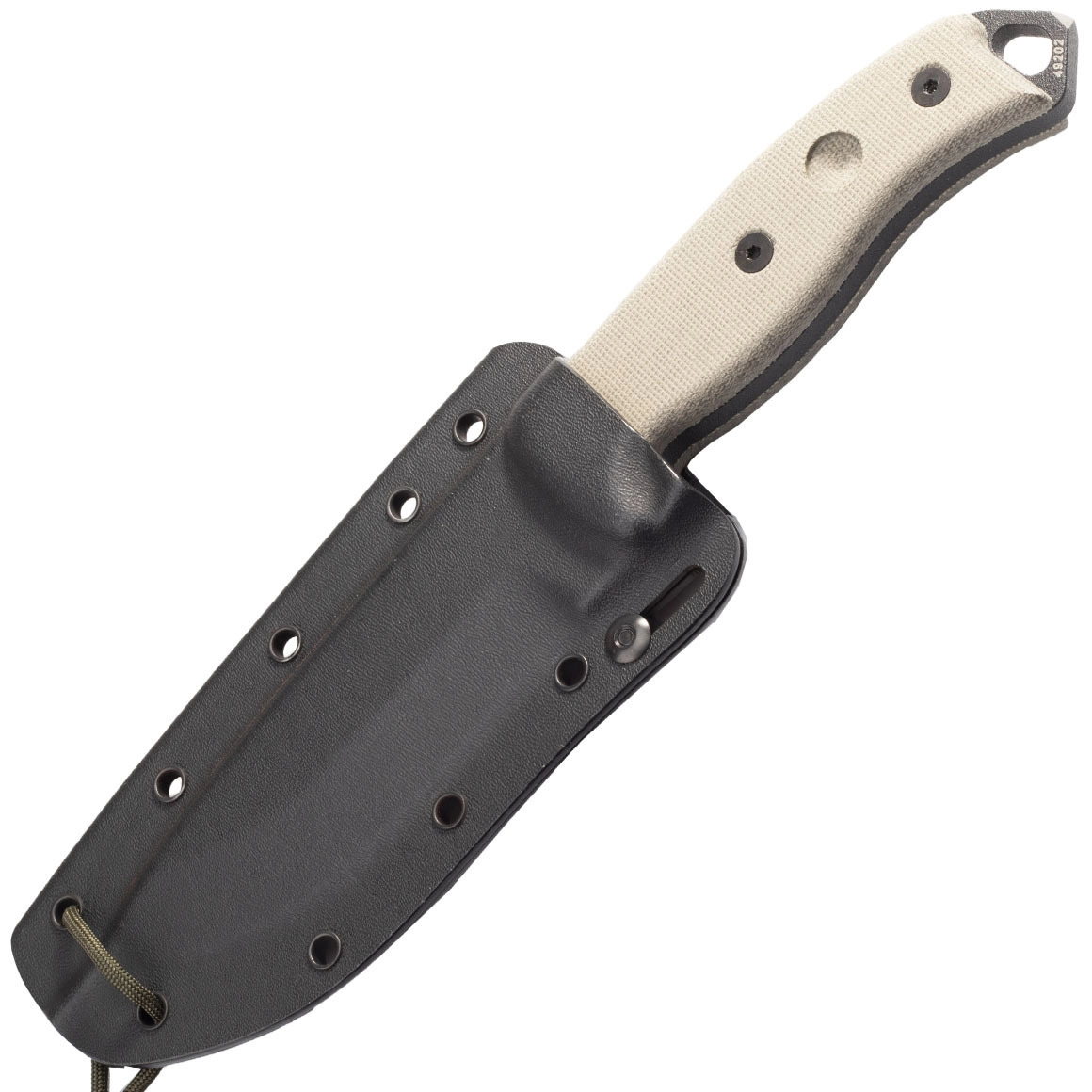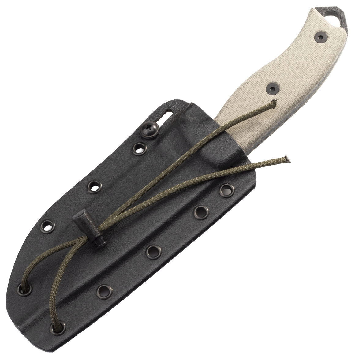 Ročaj iz canvas micarte je privijačen, varno leži v roki in nudi odličen oprijem tudi v mokrem. Ne manjkajo izrazit jimping za palec, odprtina za vrvico in jekleni razbijalec/udarni trn na koncu. Posebnost je integrirana vdolbina za bow‑drill za zanetenje ognja. Nož dopolnjuje vzdržljiva Kydex nožnica z večkratnimi odprtinami za prilagodljivo nošenje.