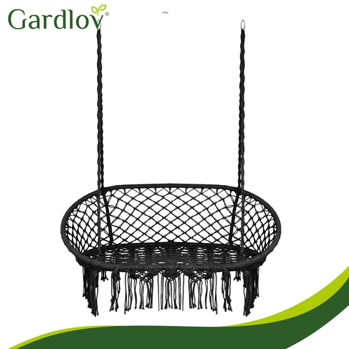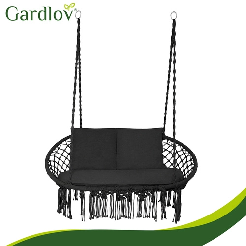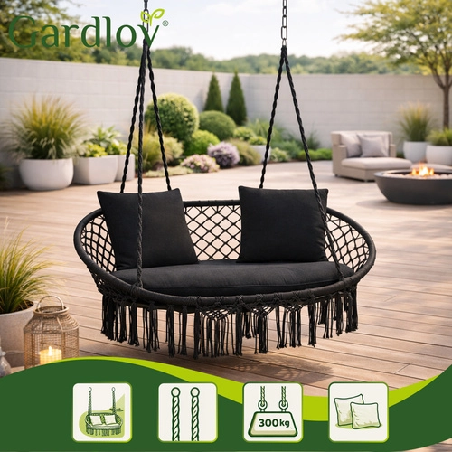 Gugalni stol GARDLOV spremeni vaš zunanji ali notranji kotiček za počitek v prijeten prostor za sprostitev. Dvojni sedež z mehkimi blazinami prijetno podpira hrbet in omogoča udobno sedenje ali polležeč položaj, medtem ko dekorativni makrame cofki dodajo sodoben boho videz.