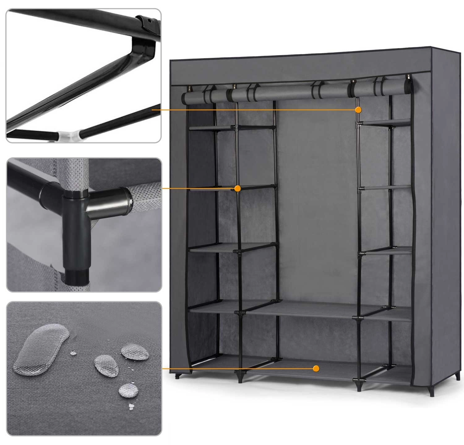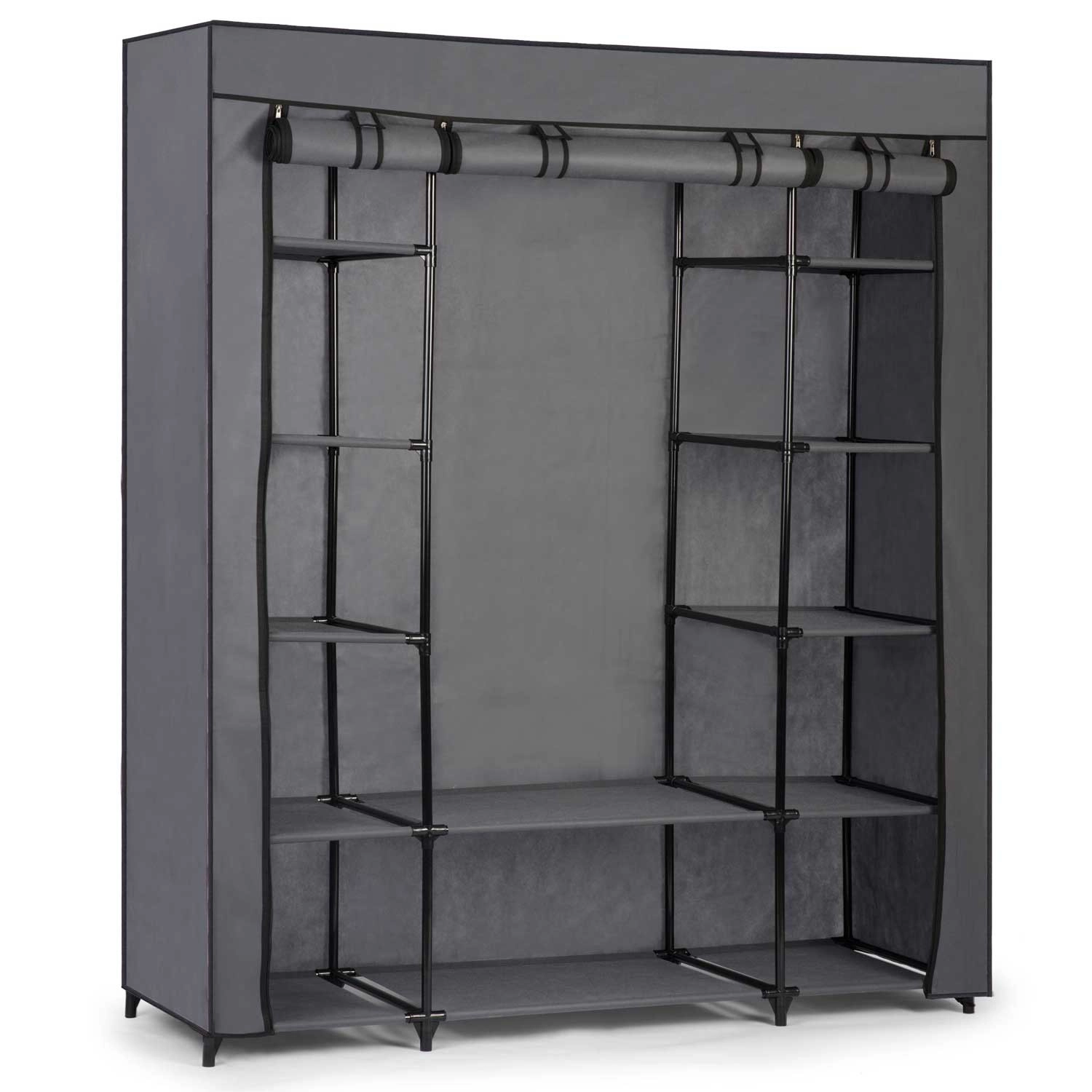 Omara nudi 12 polic z večjo nosilnostjo za zloženo perilo in dodatke ter 1 palico za obešalnike za srajce, obleke ali jakne. Sprednji del se zapira z štirimi kakovostnimi zadrgami, tako da odprete le tisti del, ki ga potrebujete. Montaža je hitra in intuitivna – brez posebnega orodja in v nekaj minutah.