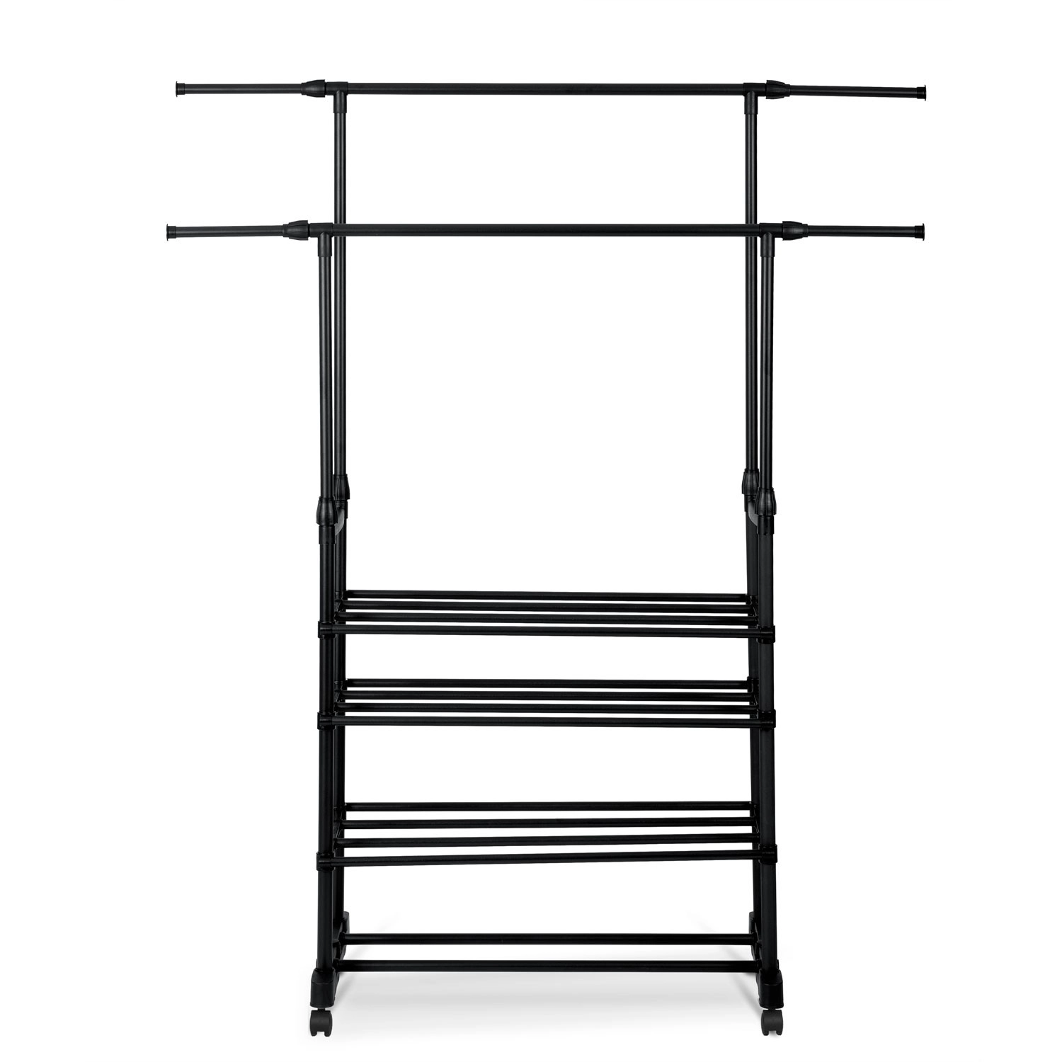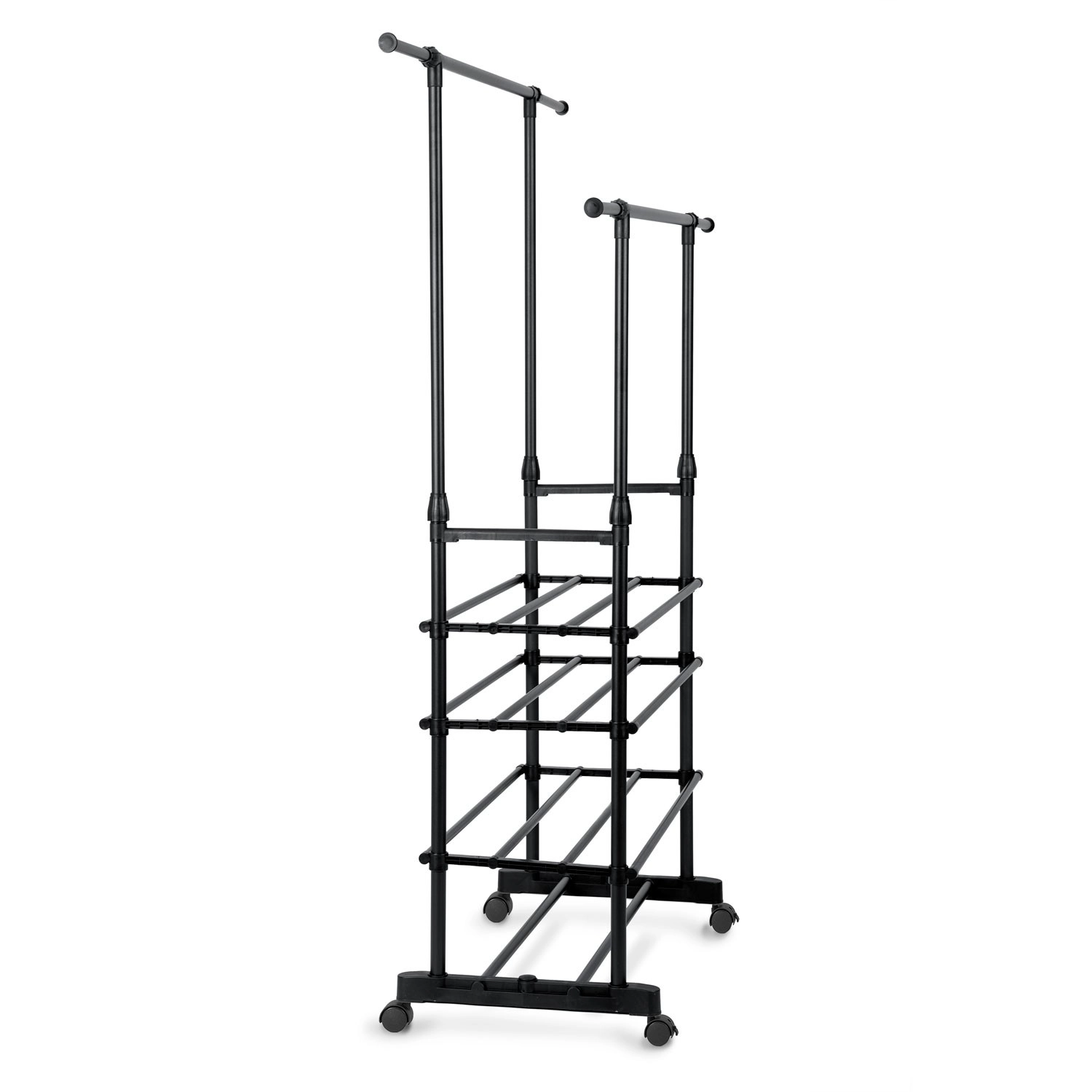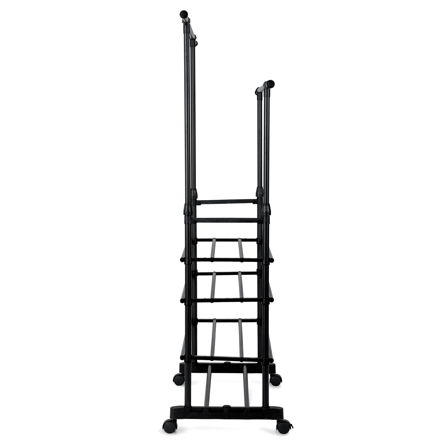 Praktično in elegantno samostoječe stojalo MASSIDO v črni barvi ponuja veliko kapaciteto, nastavljivo višino in širino ter štiri spodnje police za čevlje. Zahvaljujoč kolesom z zavoro je enostavno prestavljivo, a kljub temu stabilno in lahko. Odprta zasnova ohranja vaše srajce, plašče in dodatke pregledno urejene doma in v pisarni.