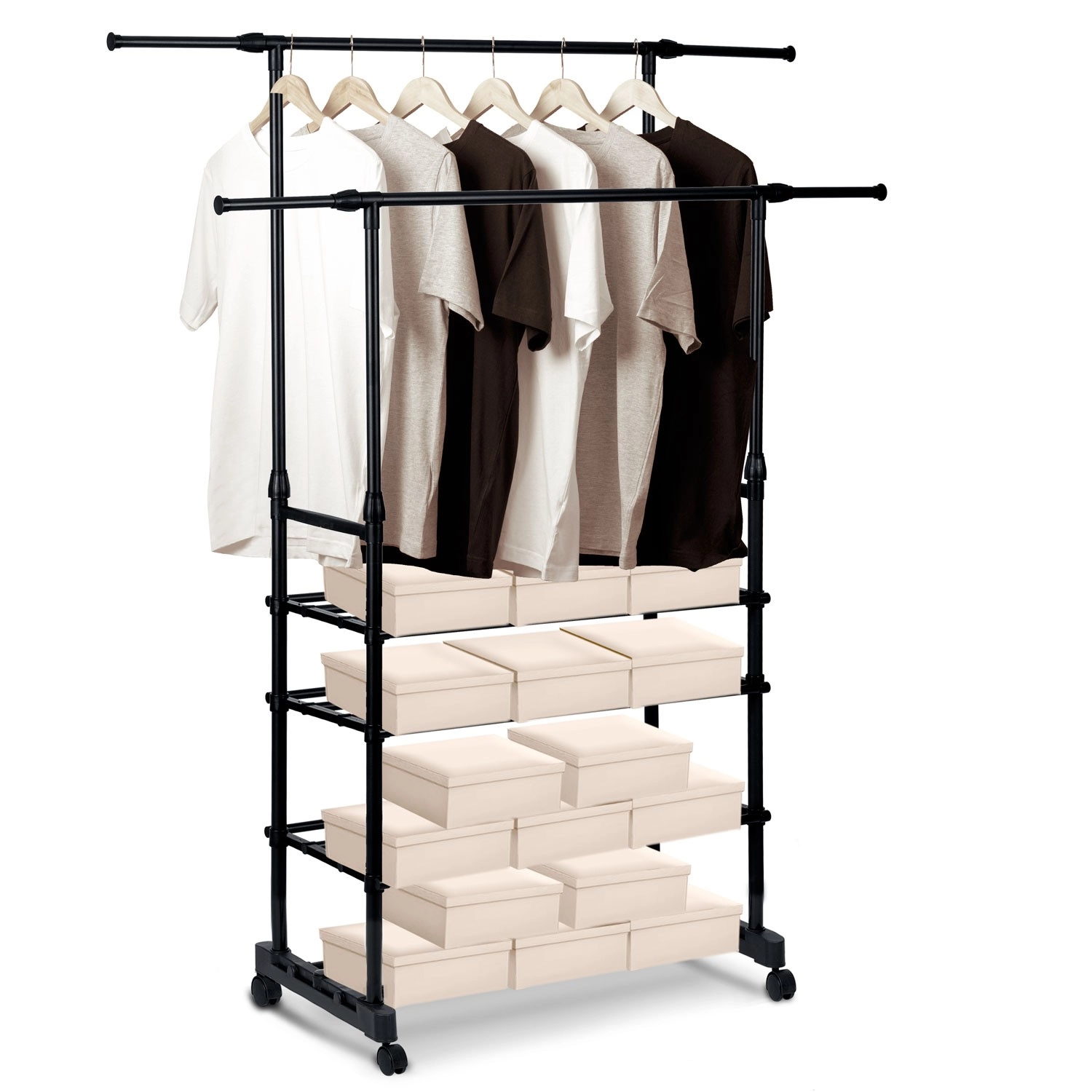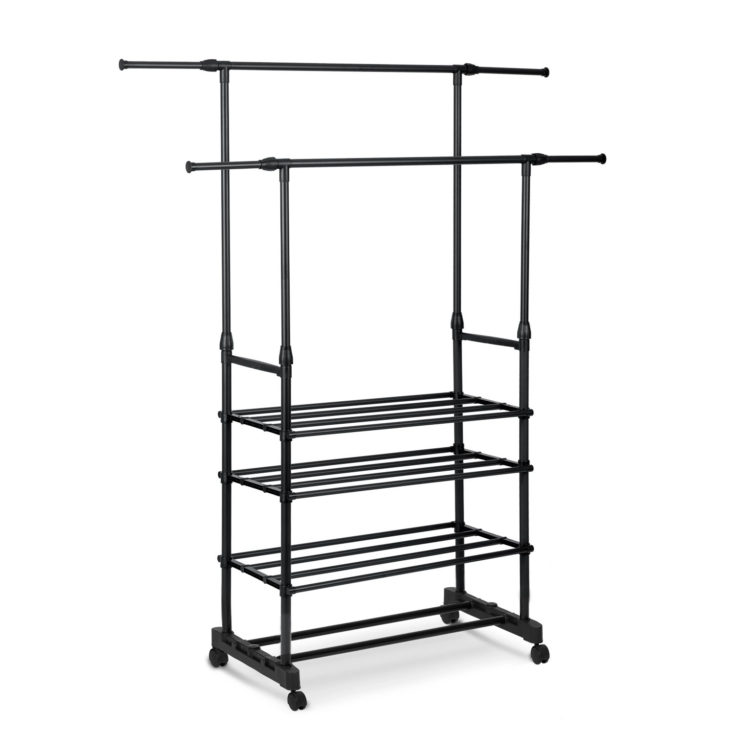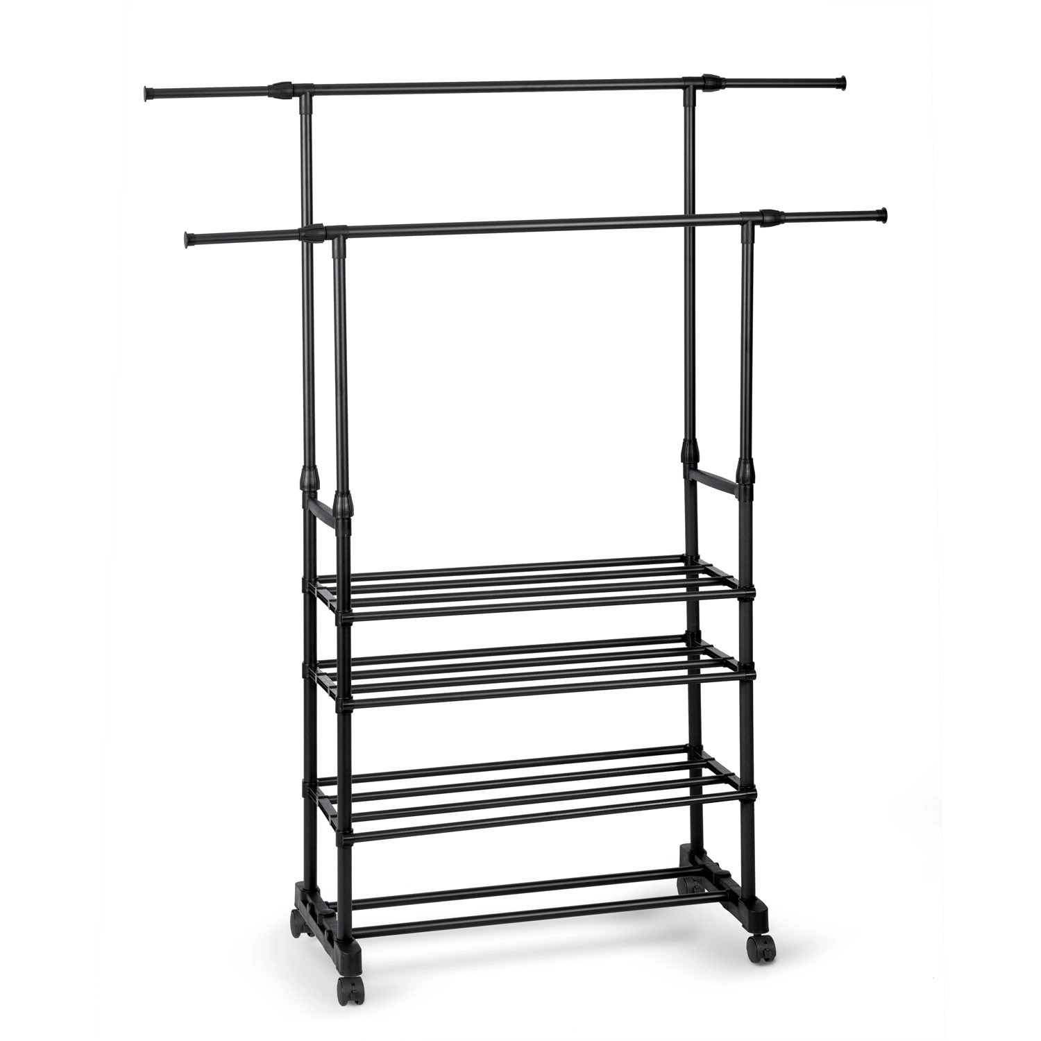 Praktično in elegantno samostoječe stojalo MASSIDO v črni barvi ponuja veliko kapaciteto, nastavljivo višino in širino ter štiri spodnje police za čevlje. Zahvaljujoč kolesom z zavoro je enostavno prestavljivo, a kljub temu stabilno in lahko. Odprta zasnova ohranja vaše srajce, plašče in dodatke pregledno urejene doma in v pisarni.