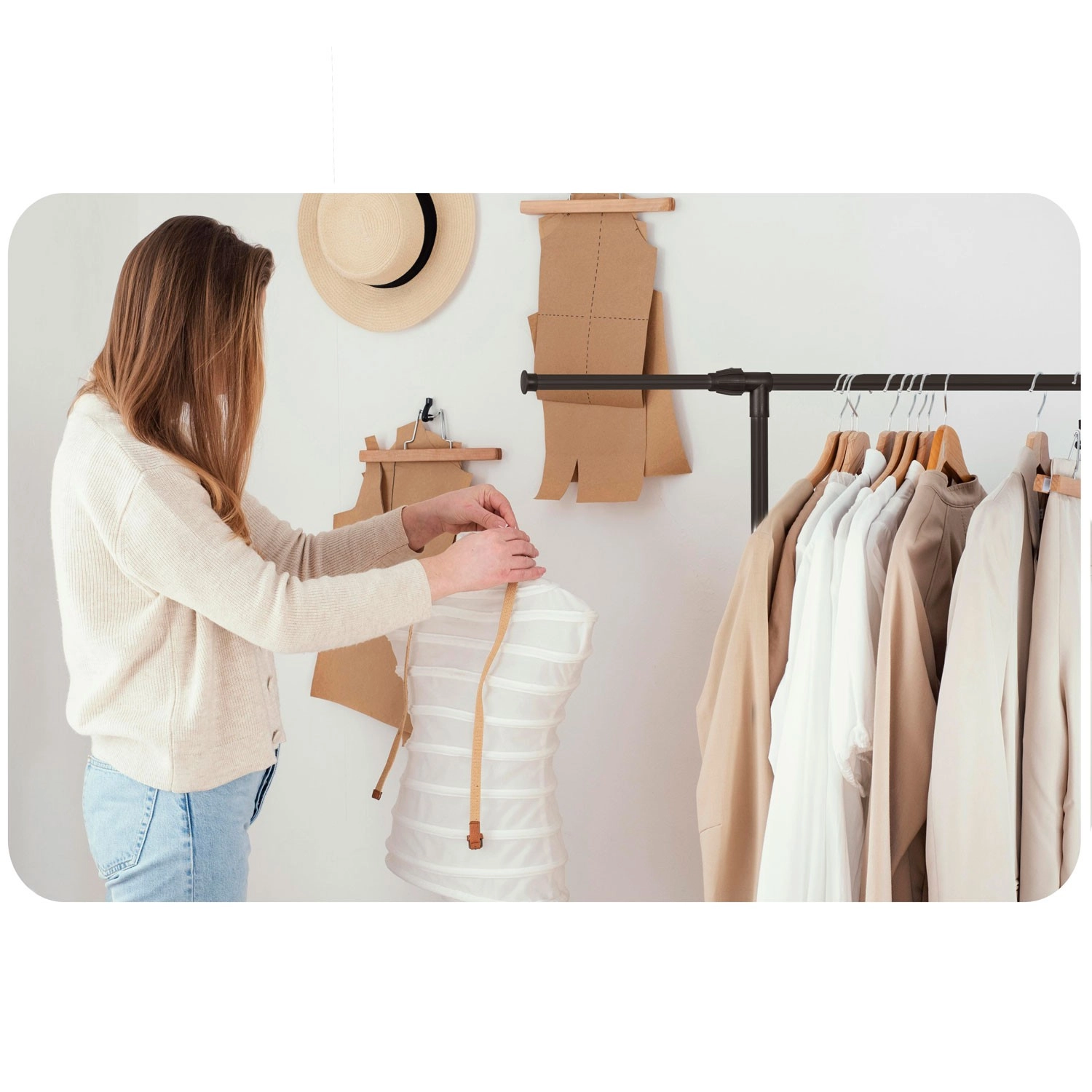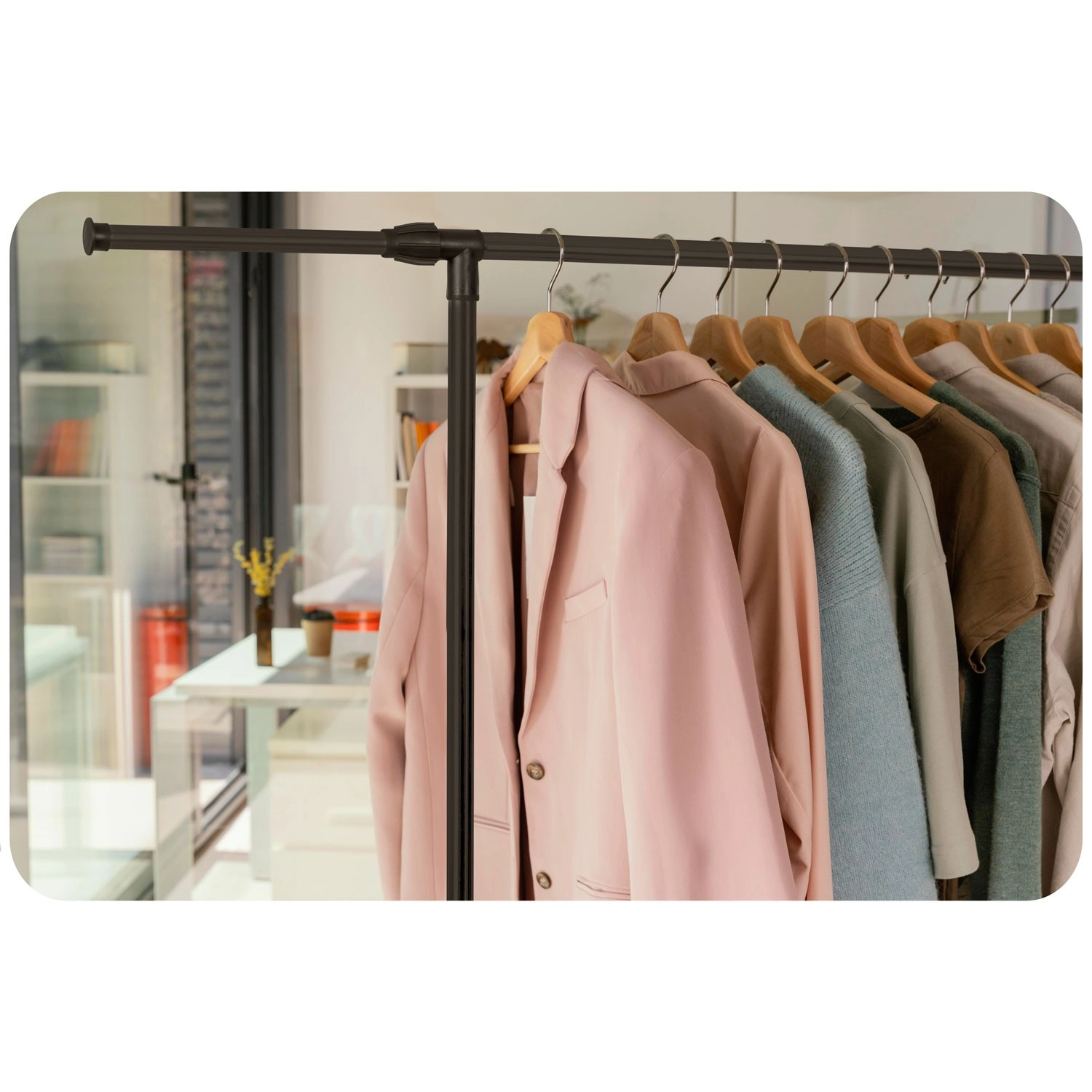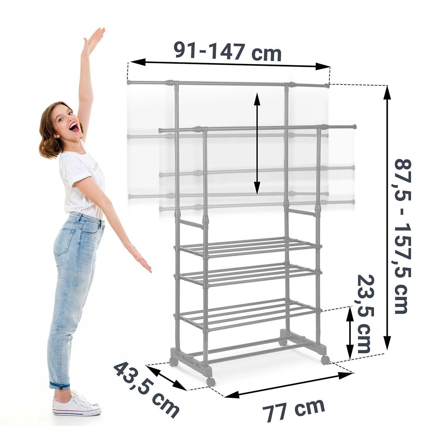 Dve zgornji vodili sprejmeta več oblačil, teleskopska stebra pa omogočata enostavno nastavitev višine za srajce in dolge plašče.