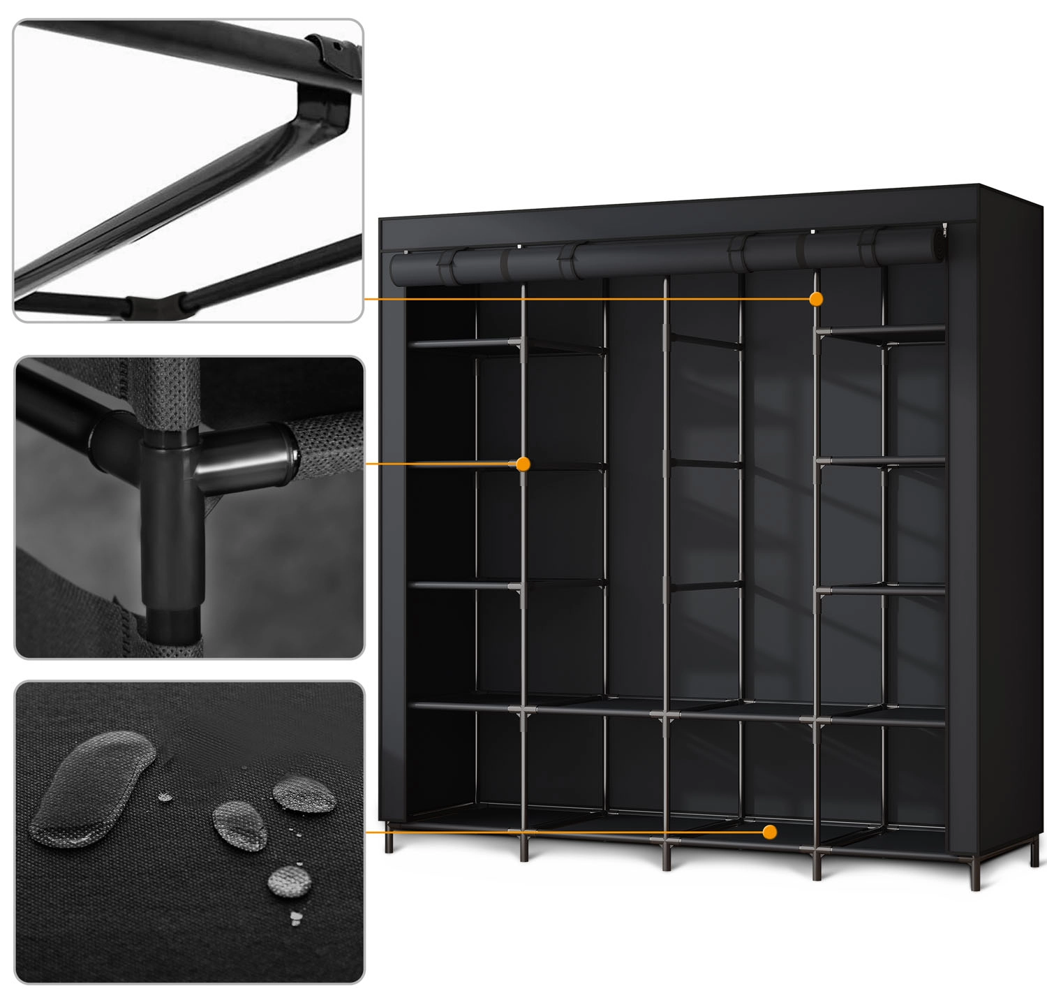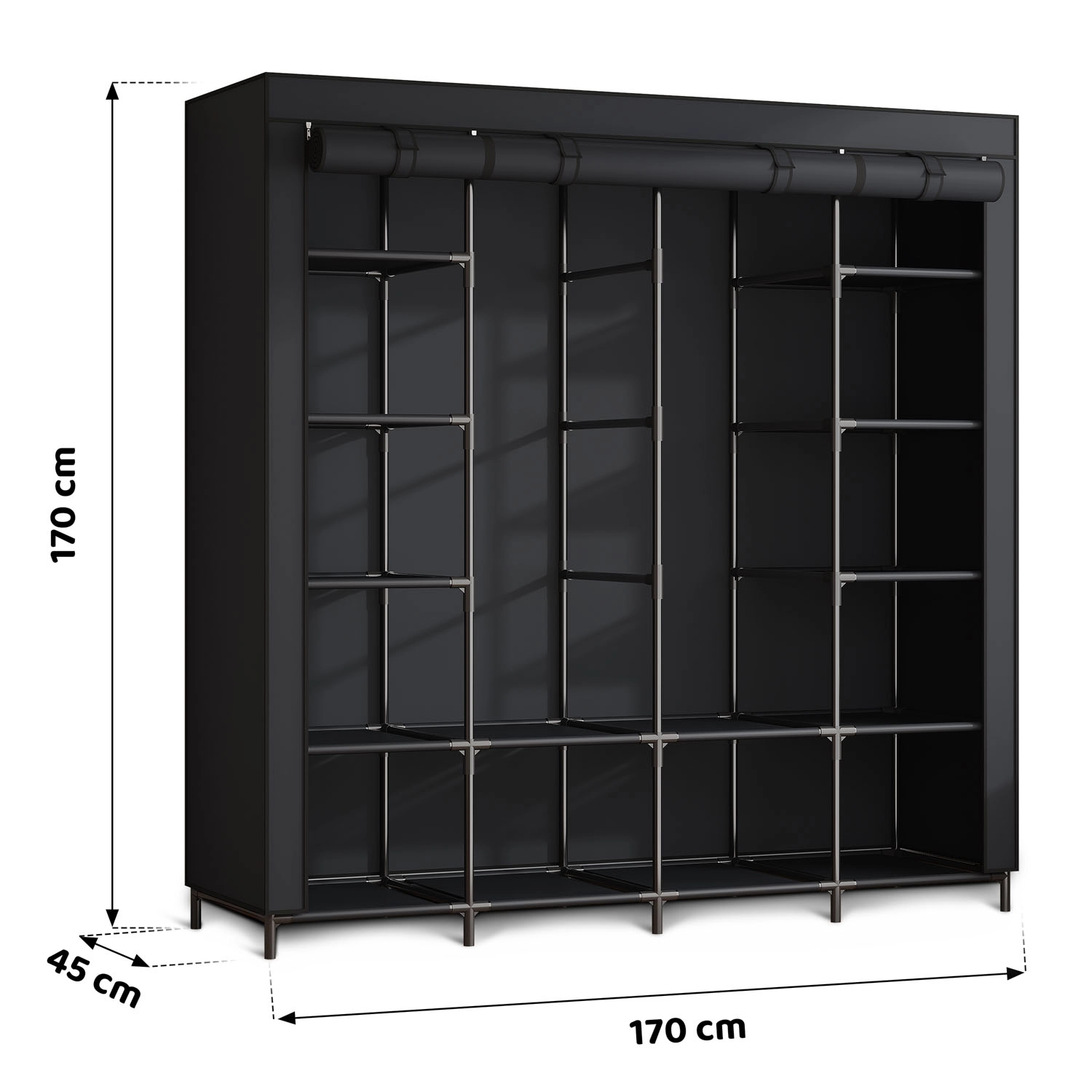 Tekstilna omara Massido je idealna rešitev za spalnice, garderobe in najemniška stanovanja. Ponuja tri samostojne cone – prostor z obešalno palico za obleke in srajce ter stranska dela z večpolicno razporeditvijo. Trdno jekleno ogrodje s PP spojkami zagotavlja stabilnost, medtem ko vodoodporno pregrinjalo varuje vaše stvari pred prahom in vlago.