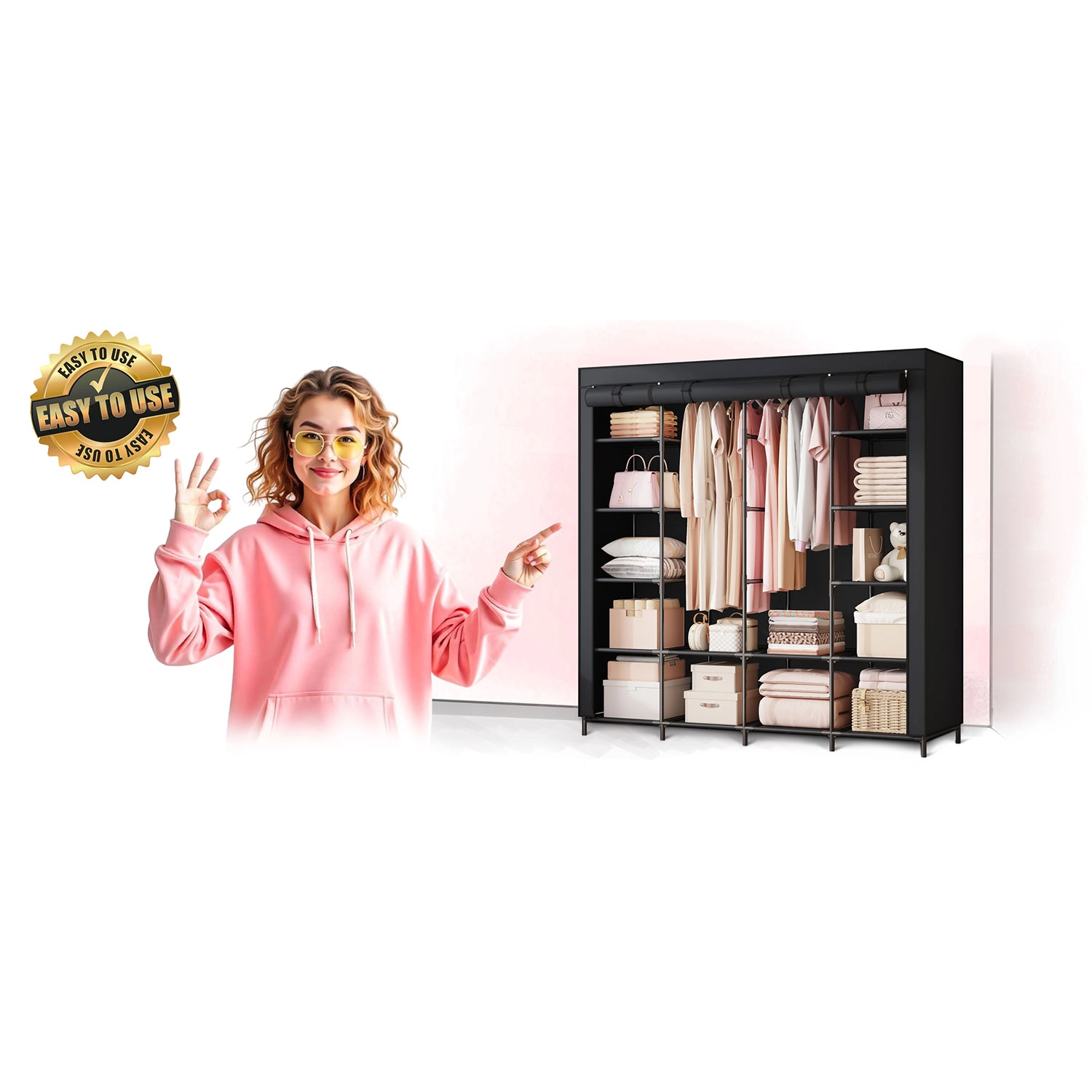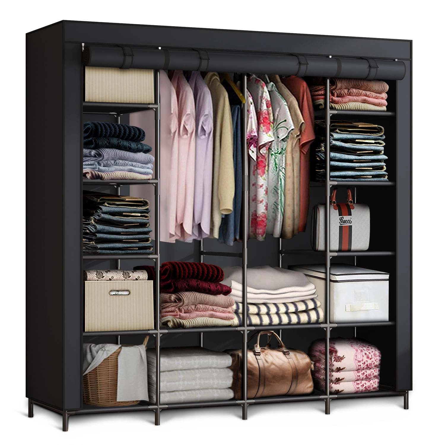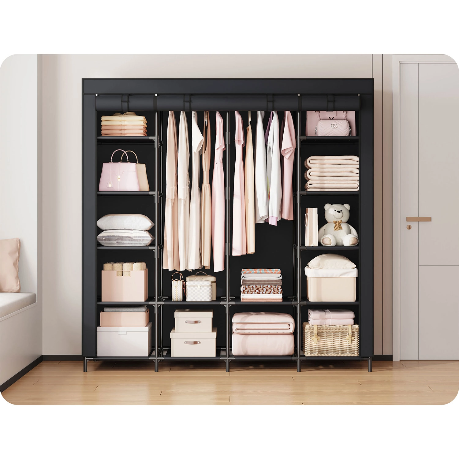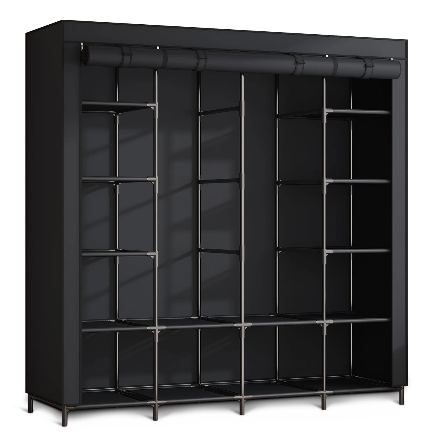 Zahvaljujoč sprednjim zadrgam in možnosti, da se paneli zvijejo navzgor, imate hiter dostop do kosov za vsak dan. Montaža je hitra in intuitivna, brez orodja. Omara je odlična za sezonska oblačila, škatle, posteljno perilo in dodatke.