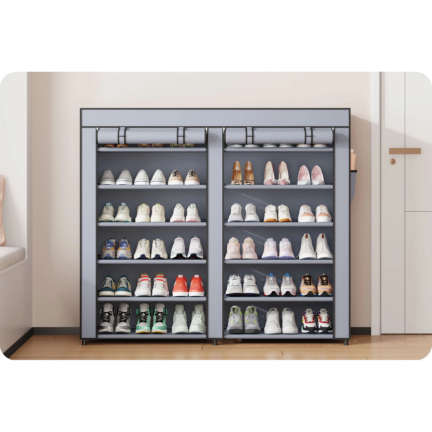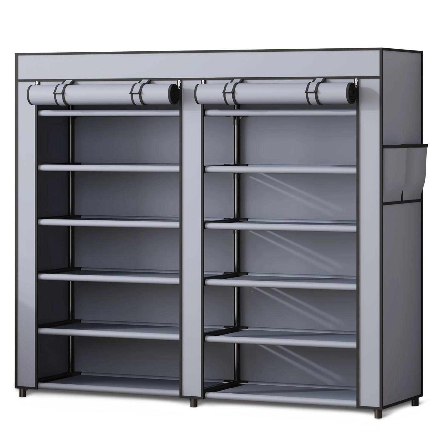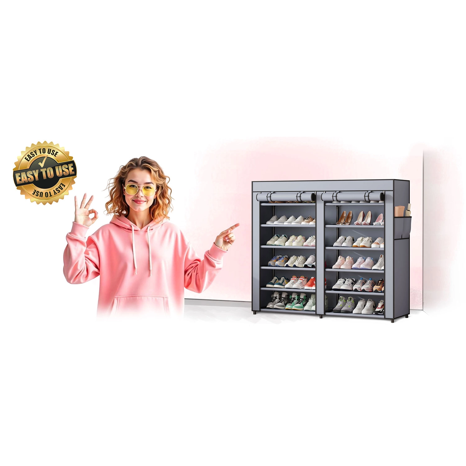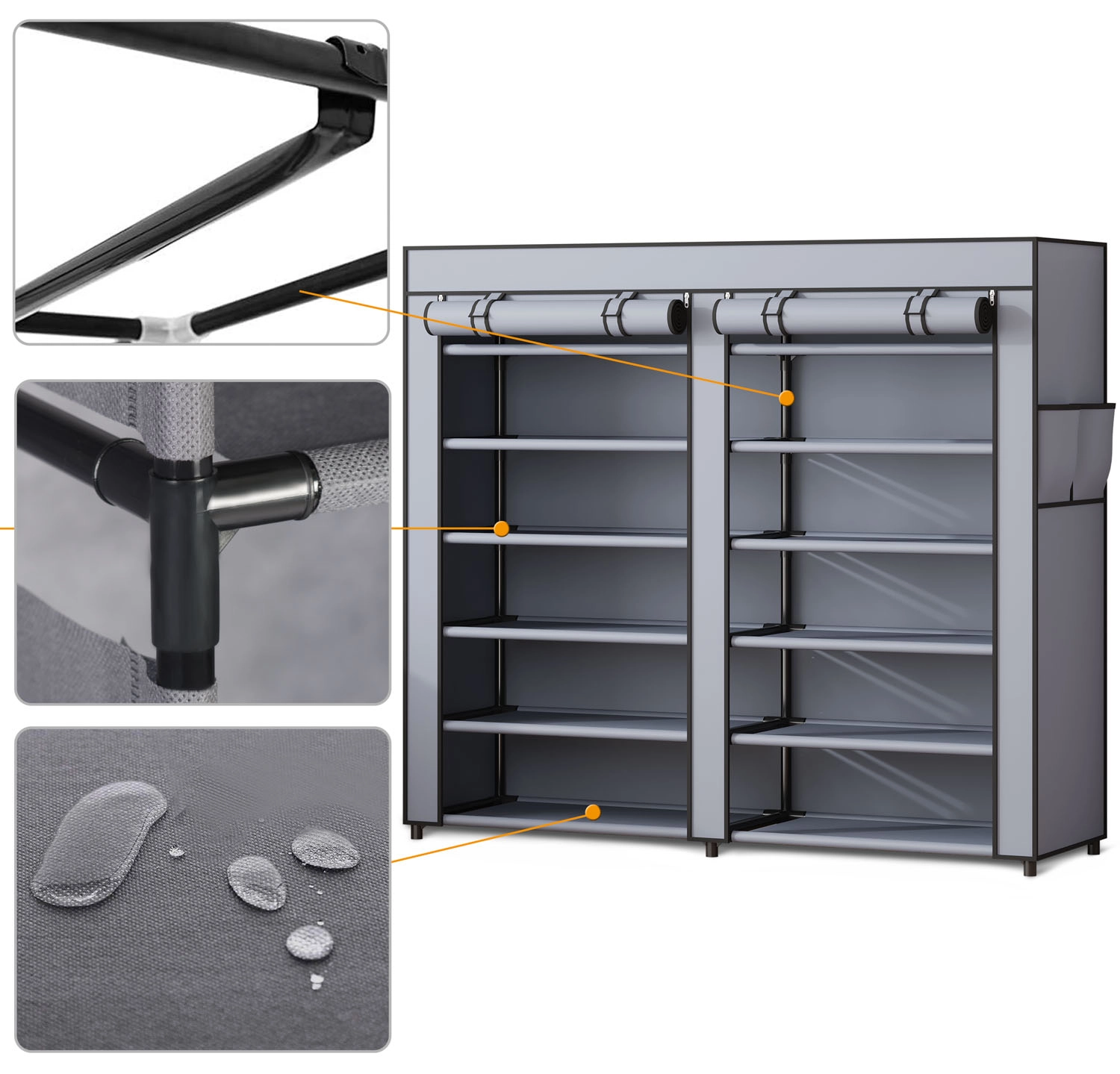 Ohranjajte red v obutvi elegantno in brez napora. Tekstilna omara za čevlje Massido združuje trden jeklen okvir s kakovostnim vodoodpornim pregrinjalom, zato bodo vaši čevlji zaščiteni pred prahom in vlago. Sprednji del se zapira s štirimi zadrgami, kar omogoča hiter dostop in pregledno shranjevanje.