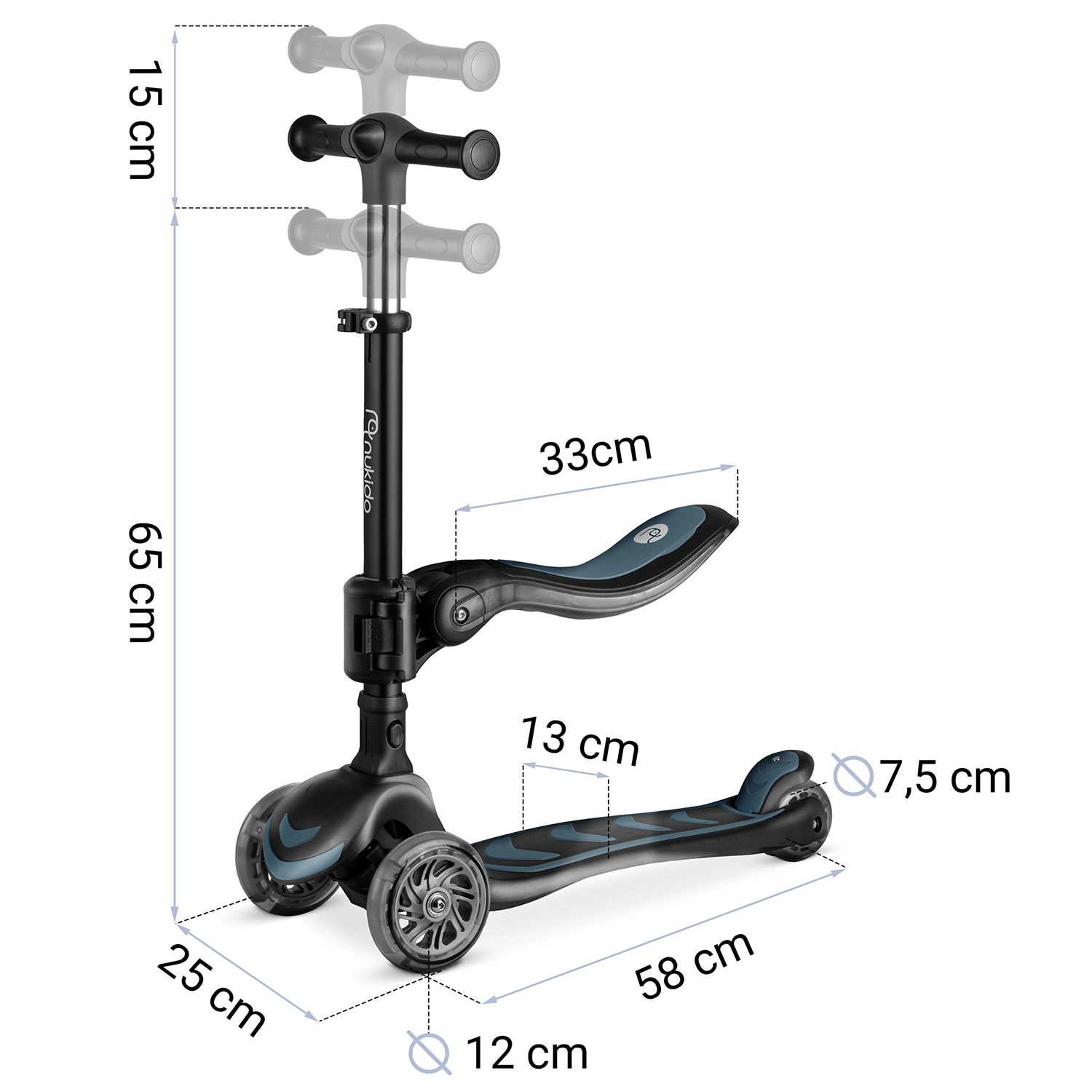 Otroški trikolesni skiro Nukido Flippo ponuja stabilno balansirno krmiljenje, višinsko nastavljiv T‑ročaj in odstranljiv sedež za udobne začetke. Zahvaljujoč široki, protizdrsni stopalki, nožni zavori in LED kolesom je vožnja zabavna in varna. Trdna konstrukcija z največjo nosilnostjo 50 kg izpolnjuje evropske varnostne standarde EN71 in je idealna za vsakodnevno vožnjo doma in na prostem.